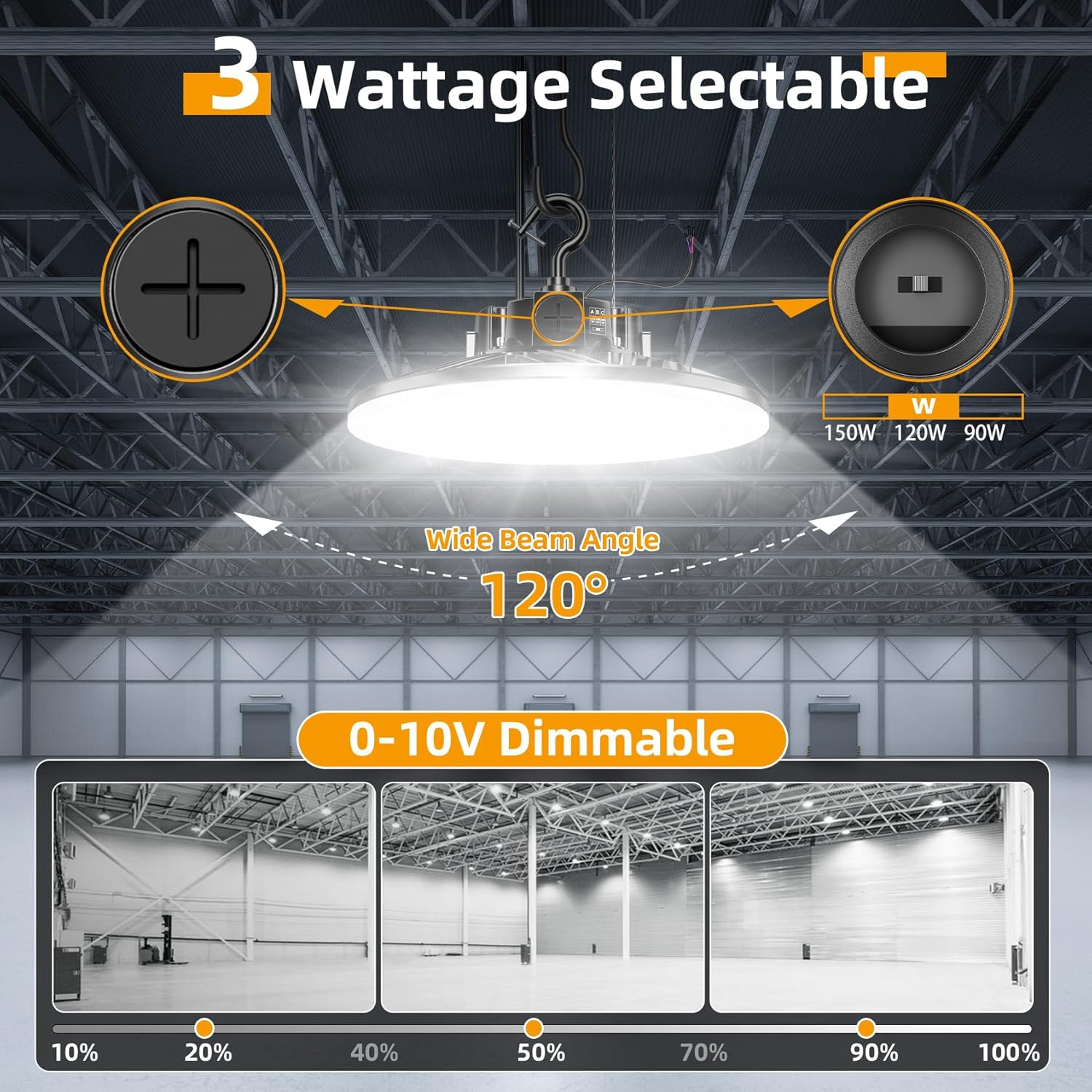 - 【3 Wattage Selectable】Using our led high bay light is equivalent to having 3 brightness LED lights 150W/100W/80W, which is equivalent to providing 21,000 lumens/14,000 lumens/11,200 lumens. Simply slide the switch to select the perfect wattage before installation to meet your different needs in warehouse, workshop, factory, garage, barn and other industrial and commercial places.