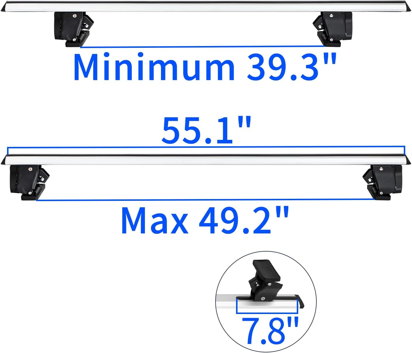 - This universal roof rack crossbar is adjustment.Measures 55" END TO END,Each cross bar measures a maximum of 49" and minimum of 39" span (useable length) for install,providing ample room for your gear!