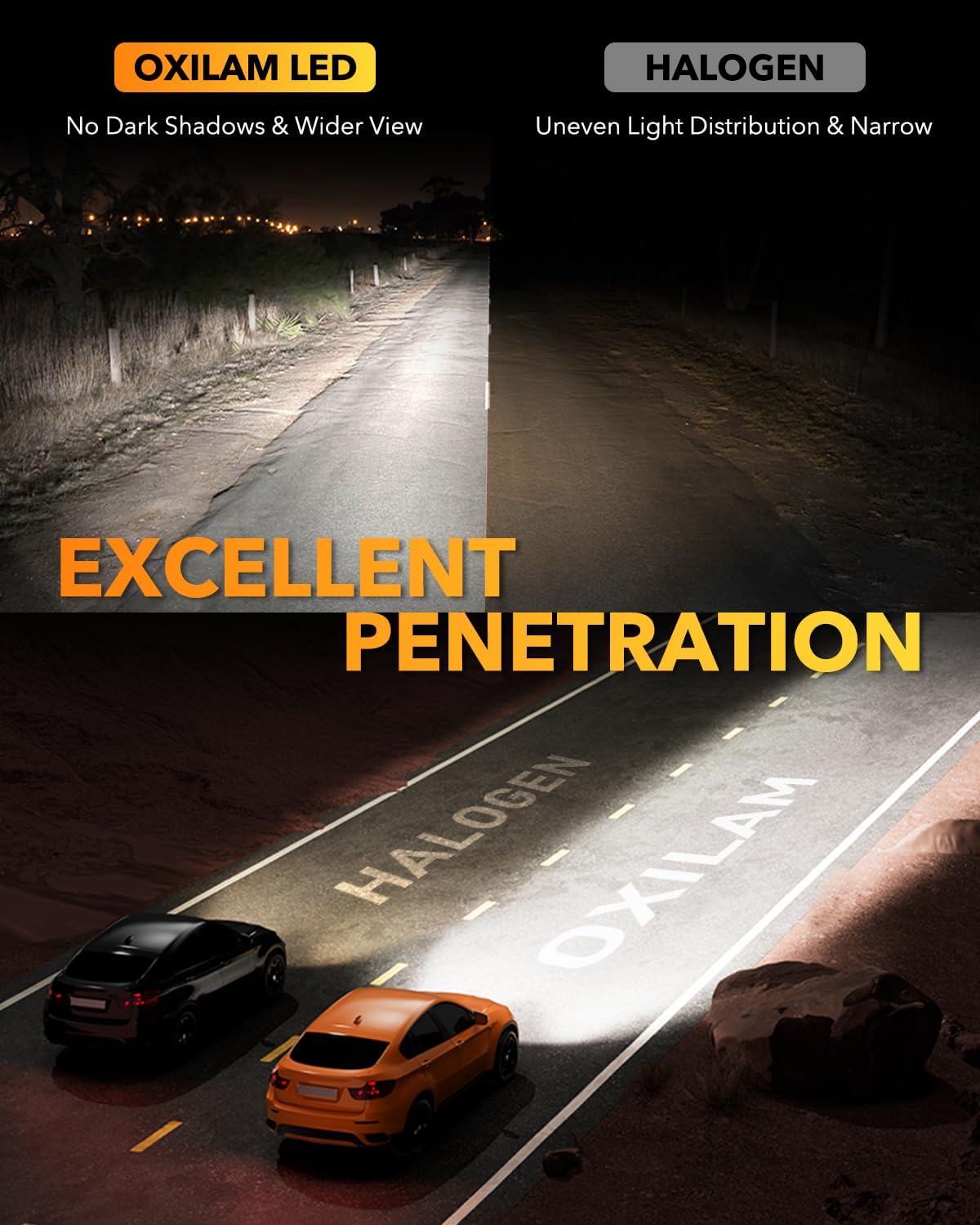 - 【600% Brighter than Halogen】Each OXILAM H10 LED fog light bulb is equipped with high-quality CSP LED chips, providing 15,000LM per set, making them 6 times brighter than halogen bulbs. The 6500K white light effectively improves visibility and extends up to 1500 feet, making your night driving safer. In heavy fog or snow, where regular headlights can’t penetrate, this is exactly when our high-penetration LED fog lights can make a difference.