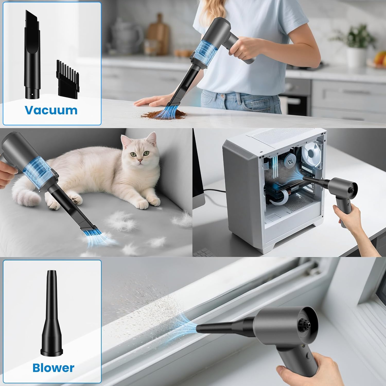 - 【4-in-1 Mini Vacuum Cleaner】 This car vacuum combines four functions: blowing, inflating, deflating, and vacuuming. With various nozzles and attachments, it offers flexibility to tackle tasks such as cleaning keyboard crevices, car interiors, inflating air mattresses, and serving as a compressor for vacuum storage bags. Tip: Each nozzle has a small alignment mark at the connection point.