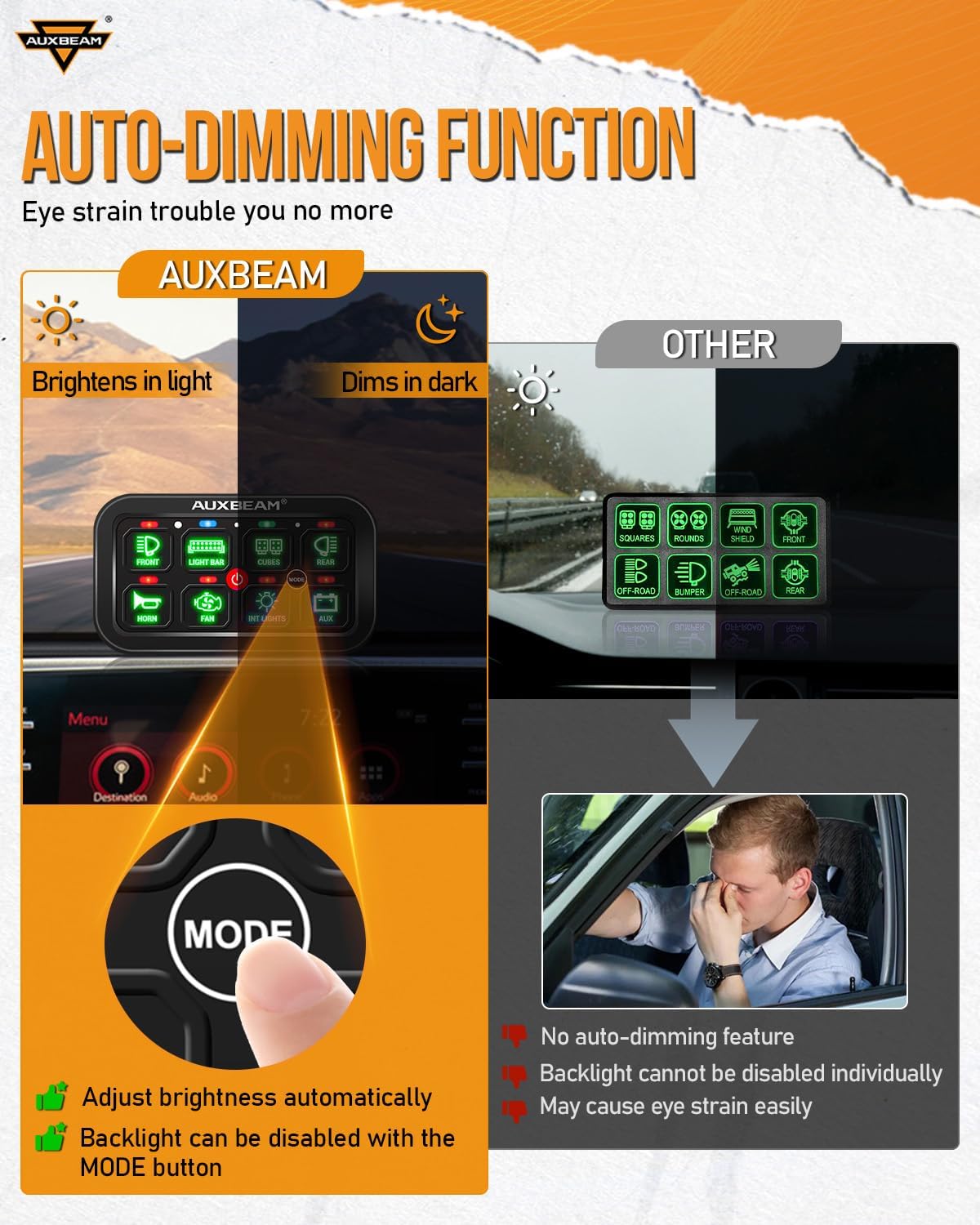 - RGB Backlight with Auto-Dimming: The Auxbeam RA80 8 gang switch panel offers a wide range of RGB backlight color options to suit your car's ambient lighting. With auto-dimming functionality, the backlight adjusts to be bright in daylight and dim at night, reducing eye strain