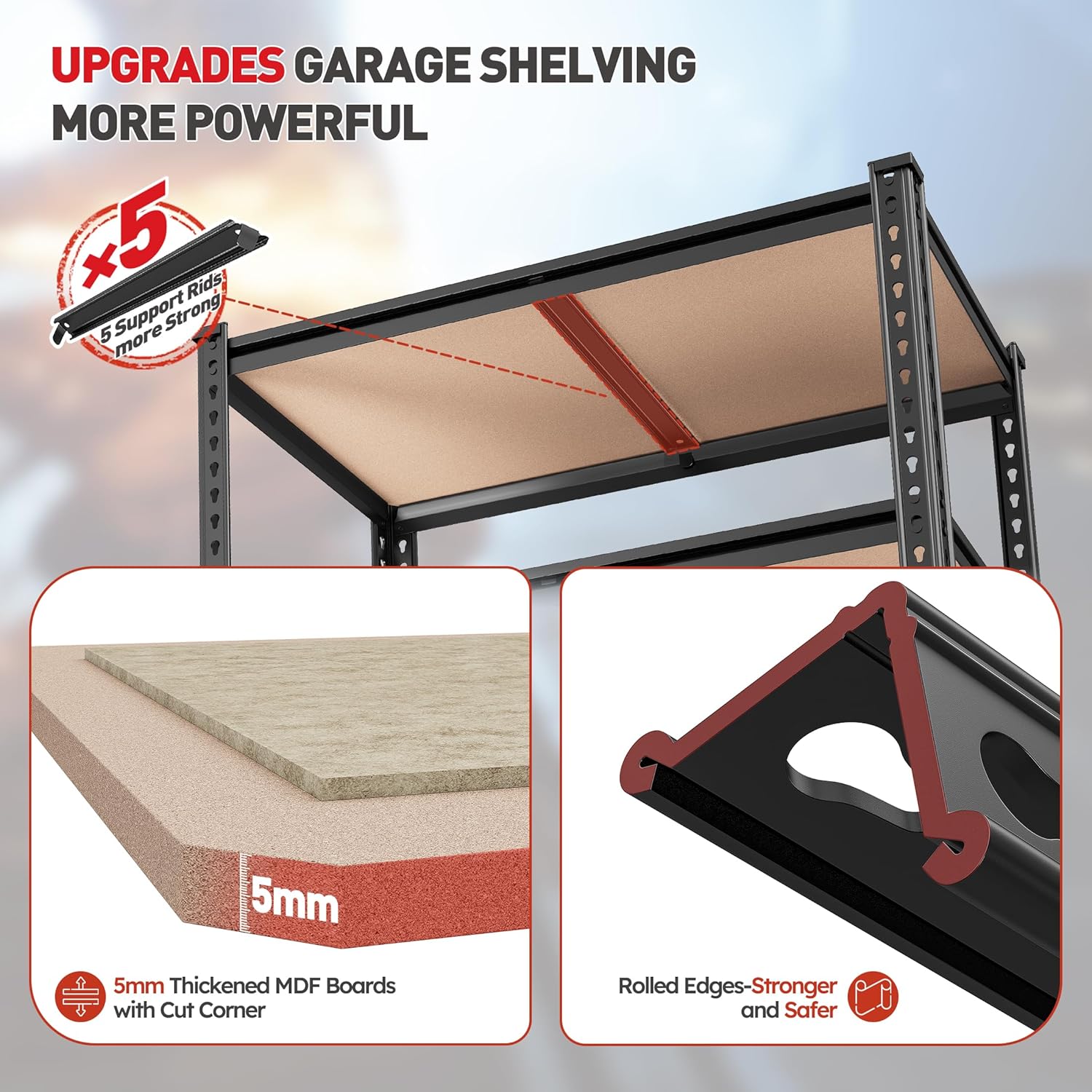 - 【Garage Shelving Heavy Duty Load 2020LBS】REIBII storage shelves feature rolled-edge thickened columns, each with support ribs. Made of high-quality metal frame and wood boards, each shelf holds up to 404 lbs, with a total capacity of 2020 lbs. The 5-tier design provides stable, solid storage for various items