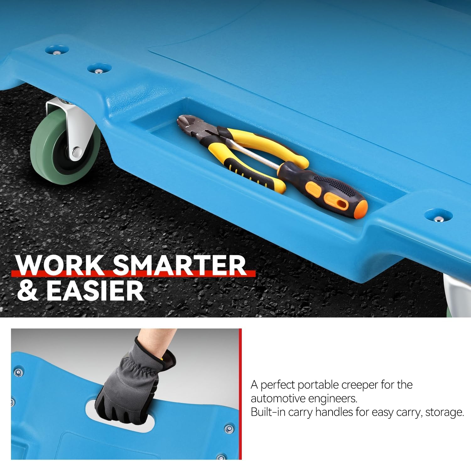 - Portable Style: This 40 inch low profile creeper can also make it easy to pick up, position, and transport with the bottom-positioned carrying handle, which ensures the work in your garage or workshop with ease.
