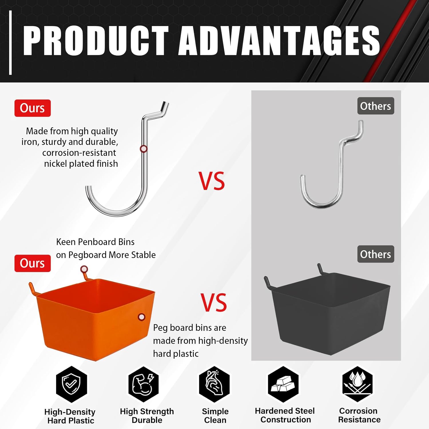 - 【Package Include】The Pegboard Wall Organizer contains 80 pegboard accessories with 13 different types of pegboard hooks that provide versatile storage solutions for a wide range of tools. They include pegboard bins, pegboard cups, straight hook, diagonal hook, curved hook, tool holder, pliers holder, padlock and so on.