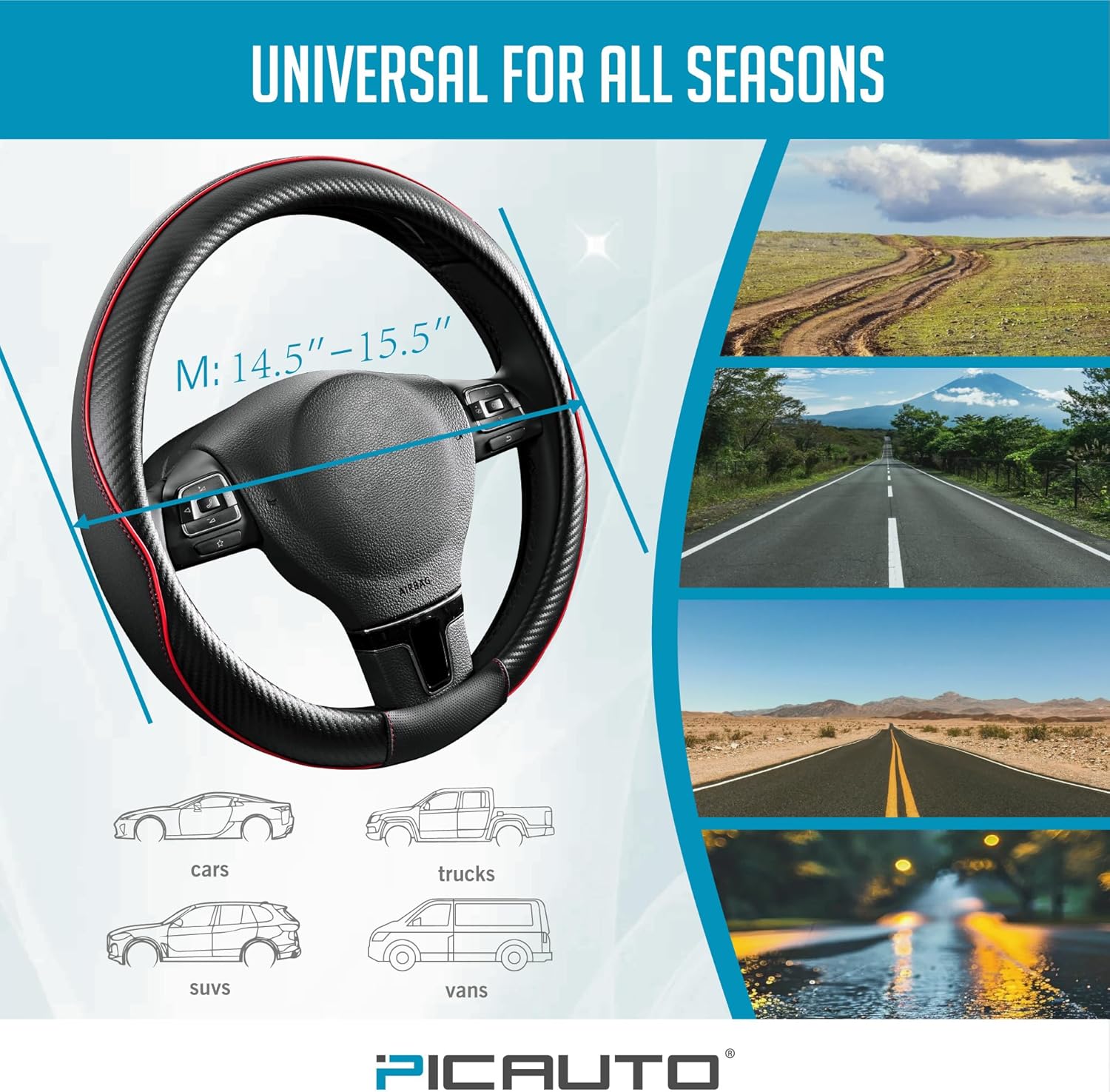 PIC AUTO Steering Wheel Cover, Red Piping Leather, Sports Carbon Fiber and Super Breathable Leather, Universal 14.5-15.5 Inch Anti-Slip Steering Wheels Accessories for Men & Women