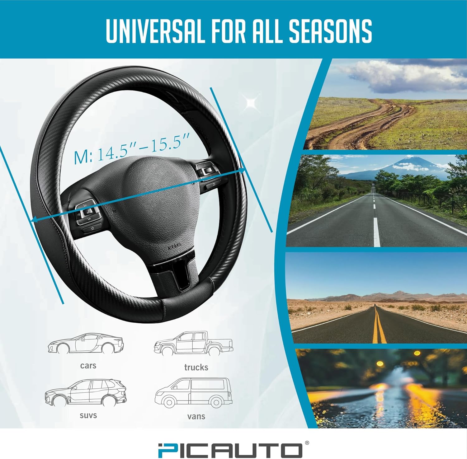 PIC AUTO Steering Wheel Cover, Black Piping Leather, Sports Carbon Fiber and Super Breathable Leather, Universal 14.5-15.5 Inch Anti-Slip Steering Wheels Accessories for Men & Women