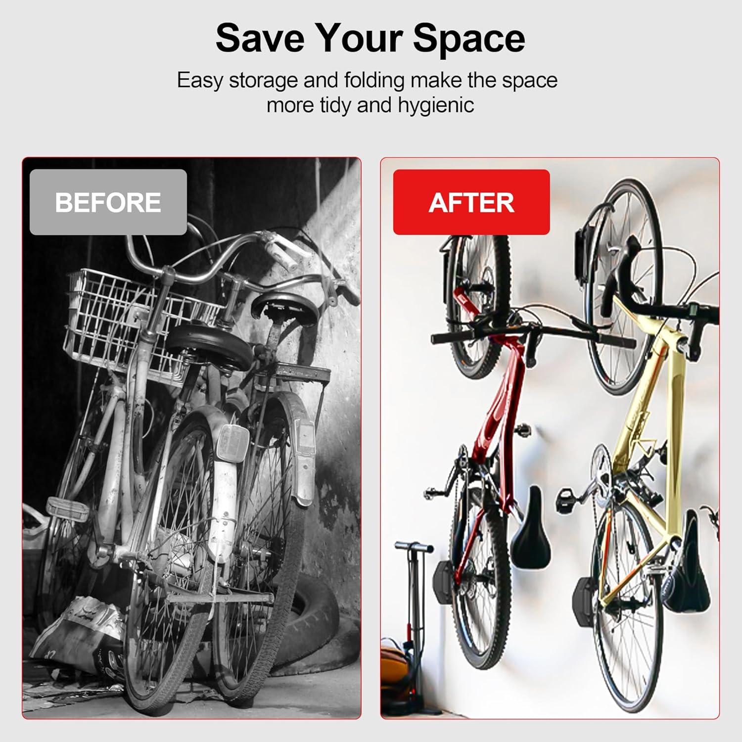 - Swivel Design : Features a built-in bearing system, allowing you to effortlessly store your bike in a center, left, or right-angled position. With a swivel range of +65° to -85°, easily pivot your bike to the left or right