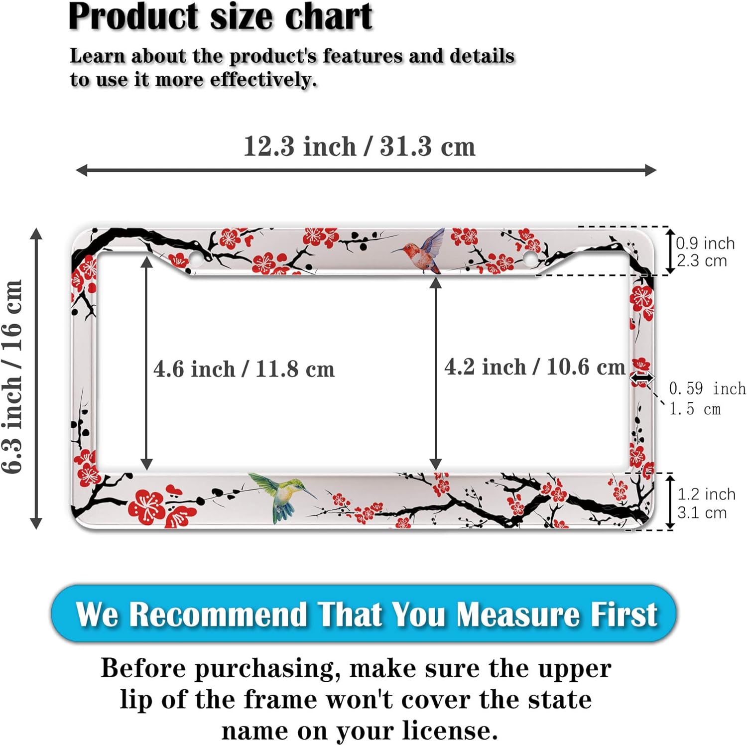 - STANDARD FRAME SIZE: Ensure a perfect fit by checking the dimensions to avoid covering your state name. These frames are specifically designed to fit standard American license plates measuring approximately 12.3" x 6.3" (16 x 31 cm). for most license plates in the U.S.