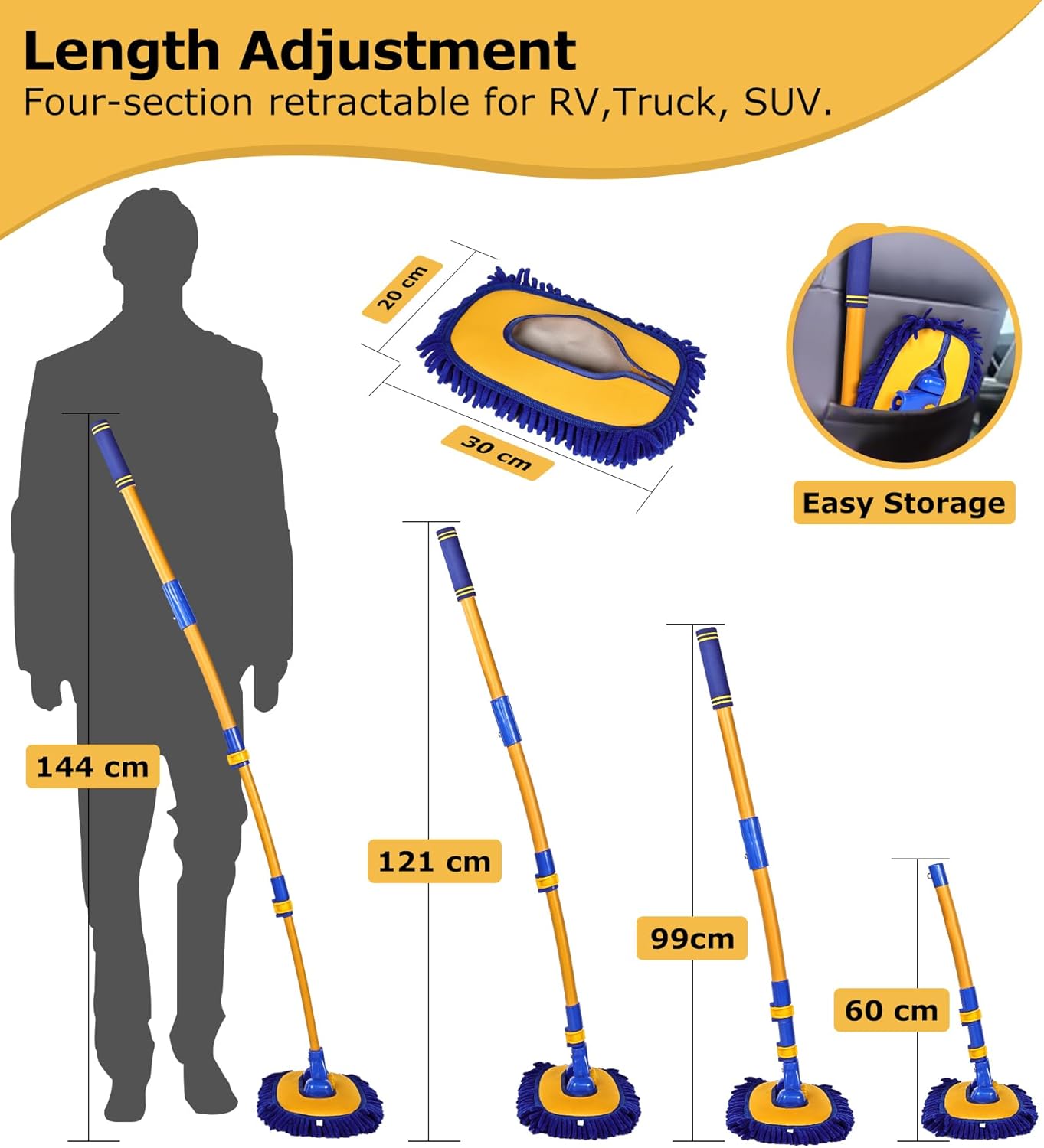 - 【Retractable Easily Disassemble Car Washing Brush】- The detachable design allows the car wash brush with long handle to easily remove the car wash mop head from the mop bar, 56.7" 4-section telescopic car mop length can be removed to 29.5inch/75cm, 33inch/85cm, 40inch/102cm respectively, which can satisfy different heights of cleaning requirements.