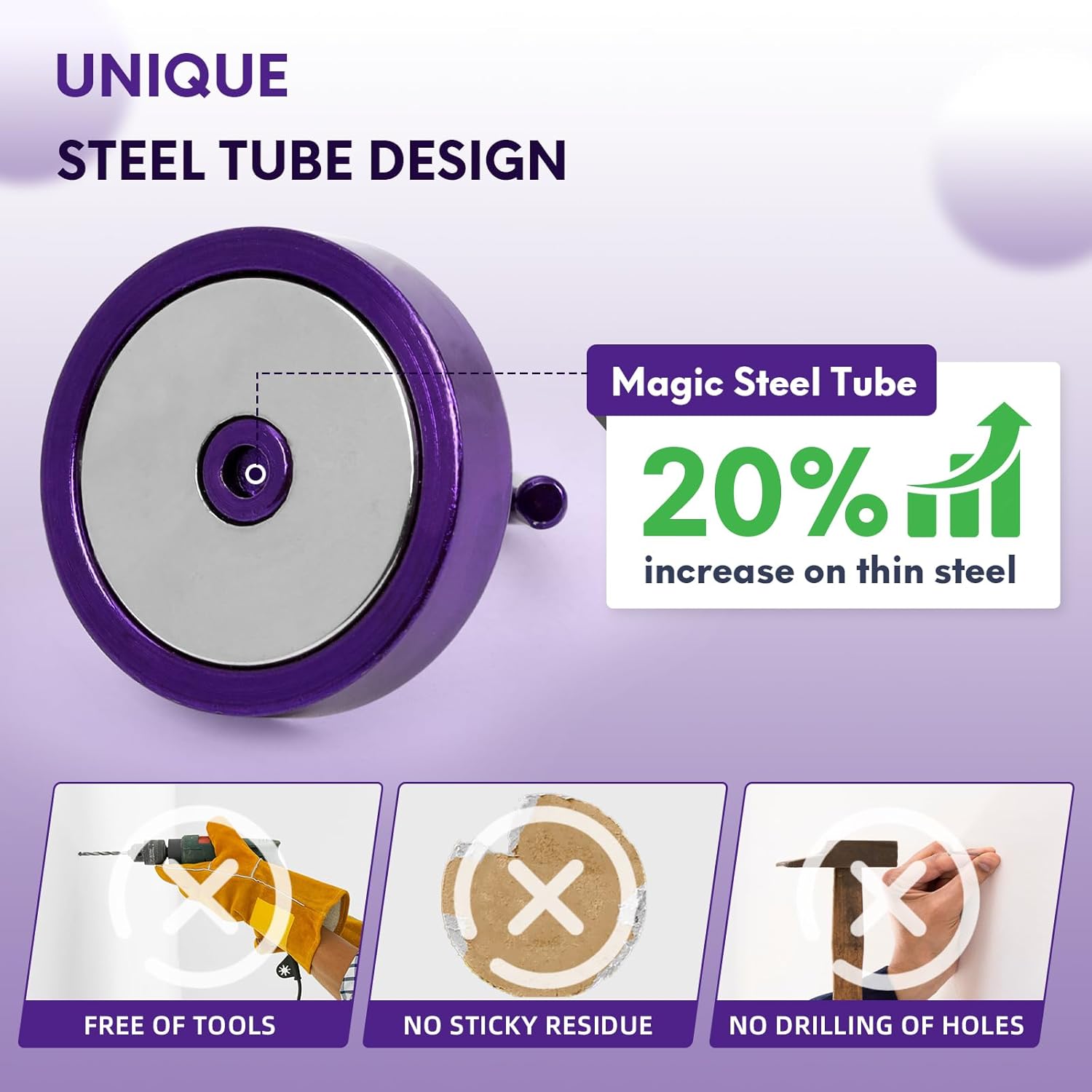 - ✔MAGIC STEEL TUBE DESIGN - Unique design of steel tube inside the base of magnetic hooks greatly increases the attractive force , especially on thin steel! It increase approximately 20% force comparing those none-tube magnets. it solves the problem of weak force on thin steel. Permanent magnetic hook with magic steel tube, strong magnetism lasts forever!