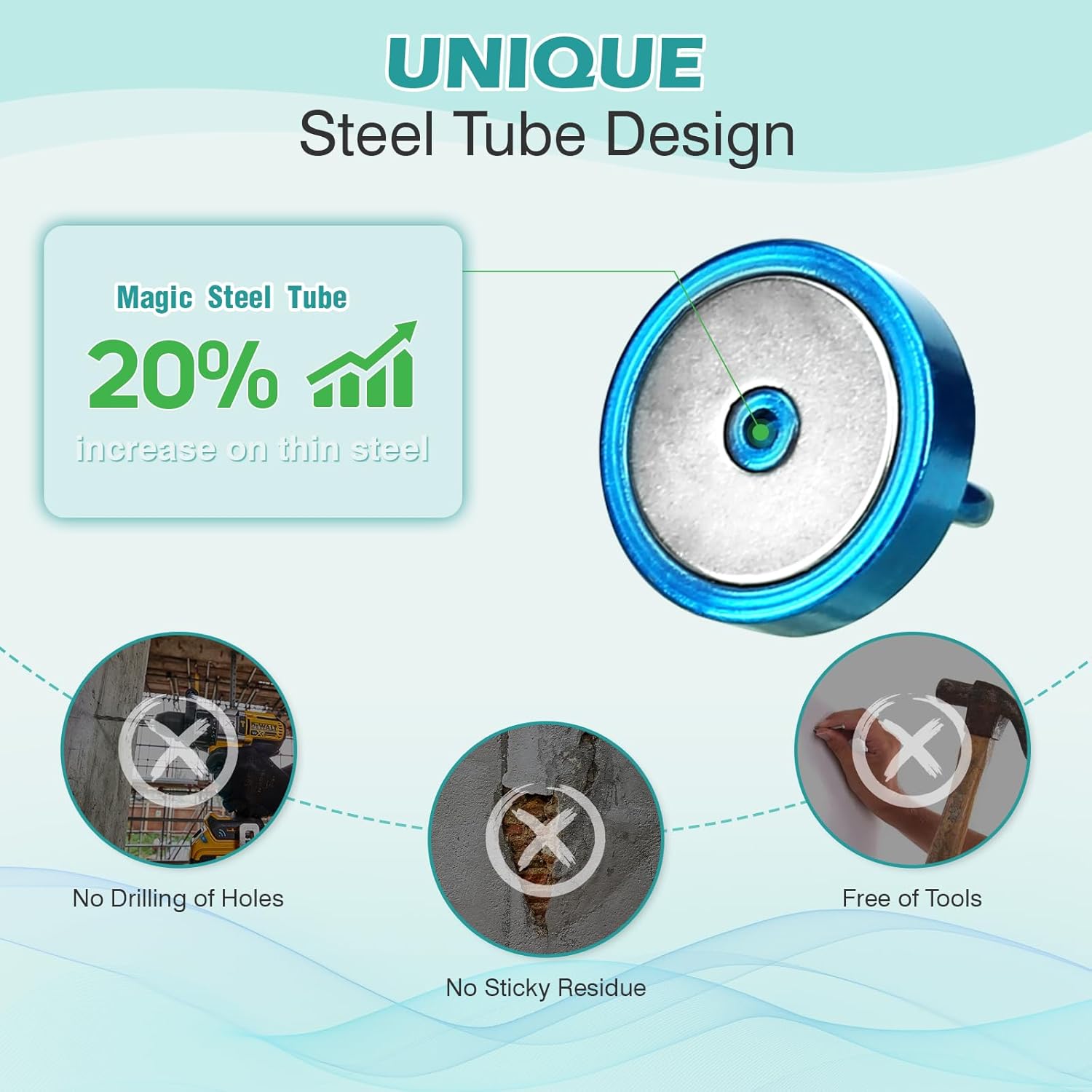 - ✔MAGIC STEEL TUBE DESIGN - Unique design of steel tube inside the base of magnetic hooks greatly increases the attractive force , especially on thin steel! It increase approximately 20% force comparing those none-tube magnets. it solves the problem of weak force on thin steel. Permanent magnetic hook with magic steel tube, strong magnetism lasts forever!