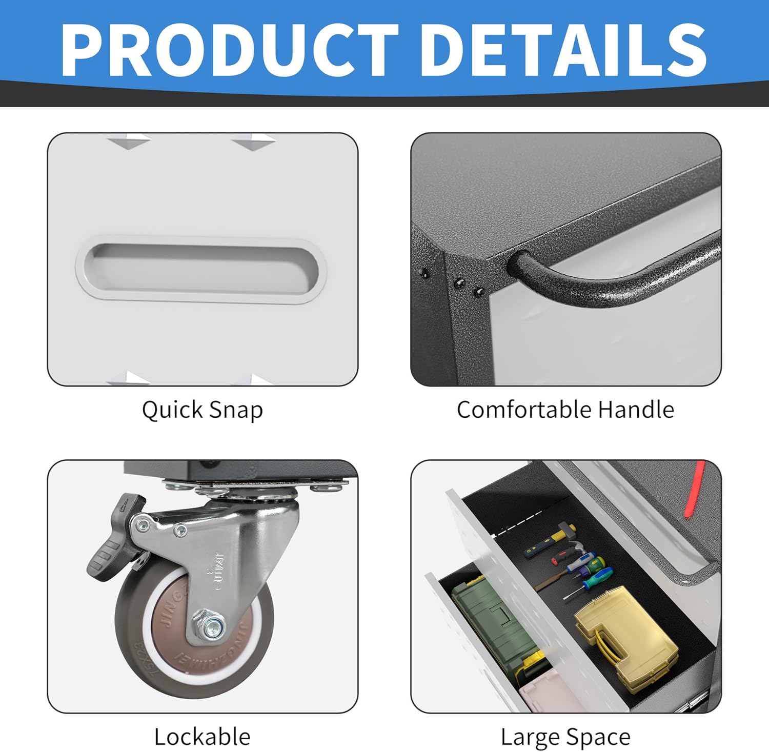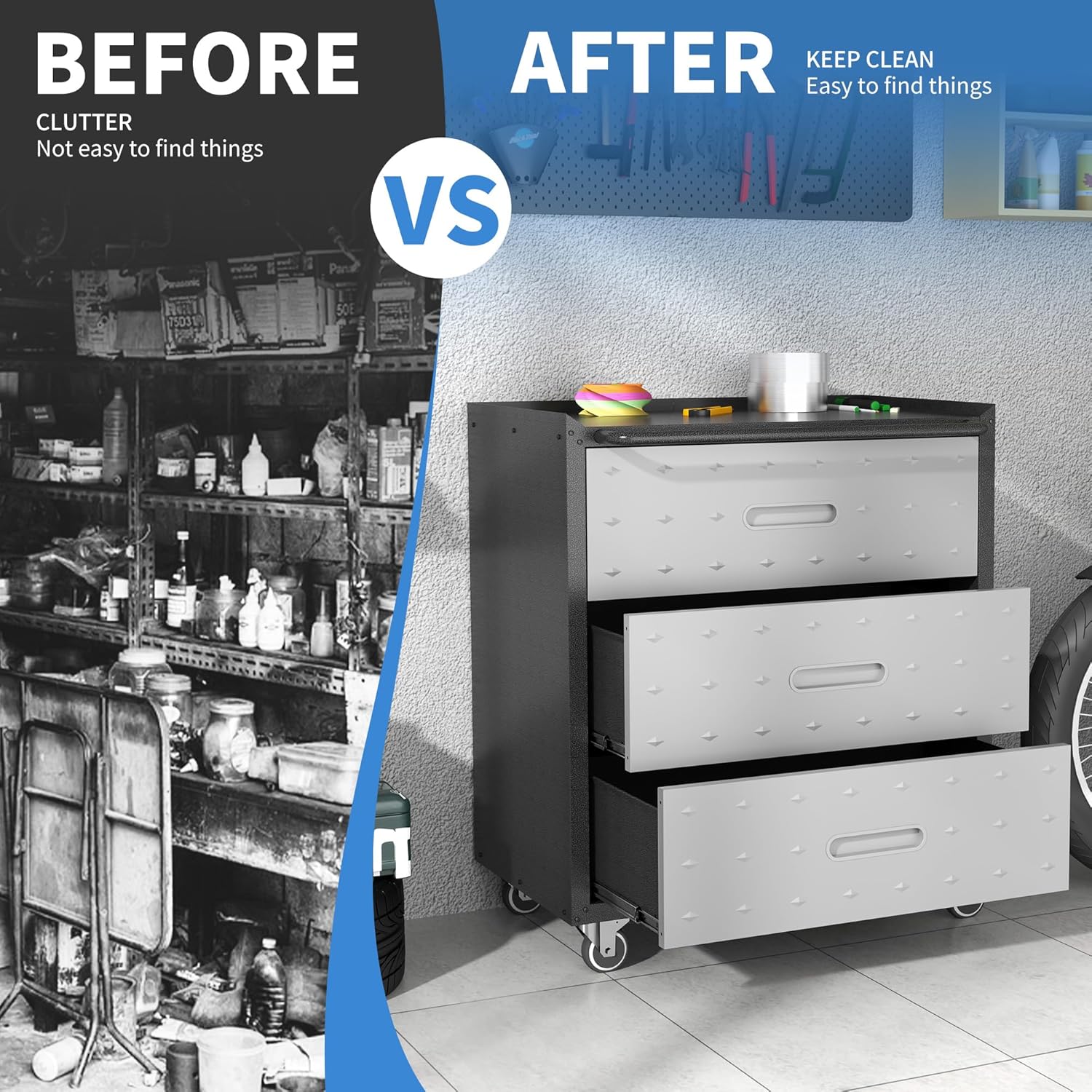 - Sturdy and Durable Structure:This cabinet with wheels is made of high quality cold rolled steel and is powder coated to be waterproof and fireproof, ensuring long lasting performance and durability.It is suitable for garage/warehouse/tool room/repair room.