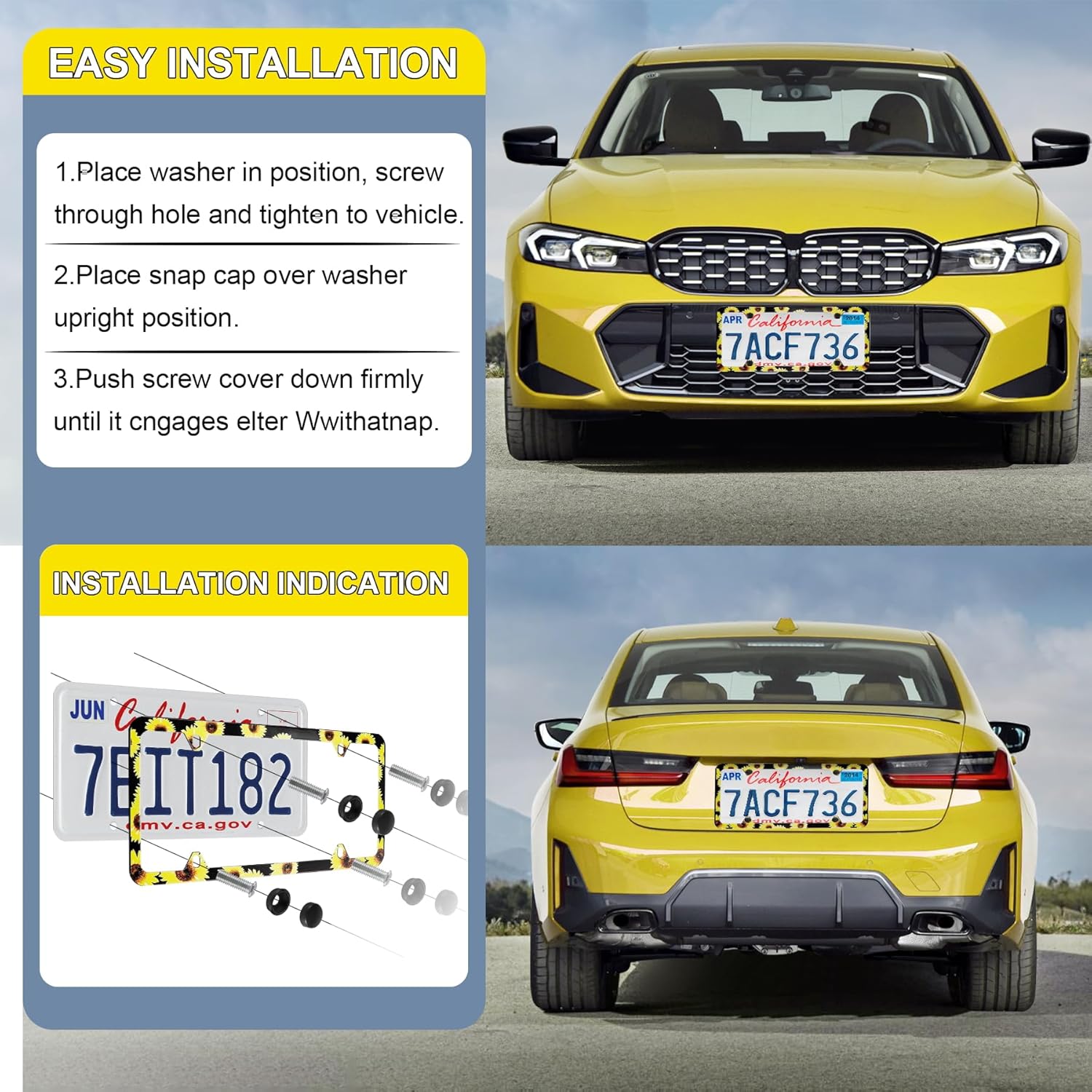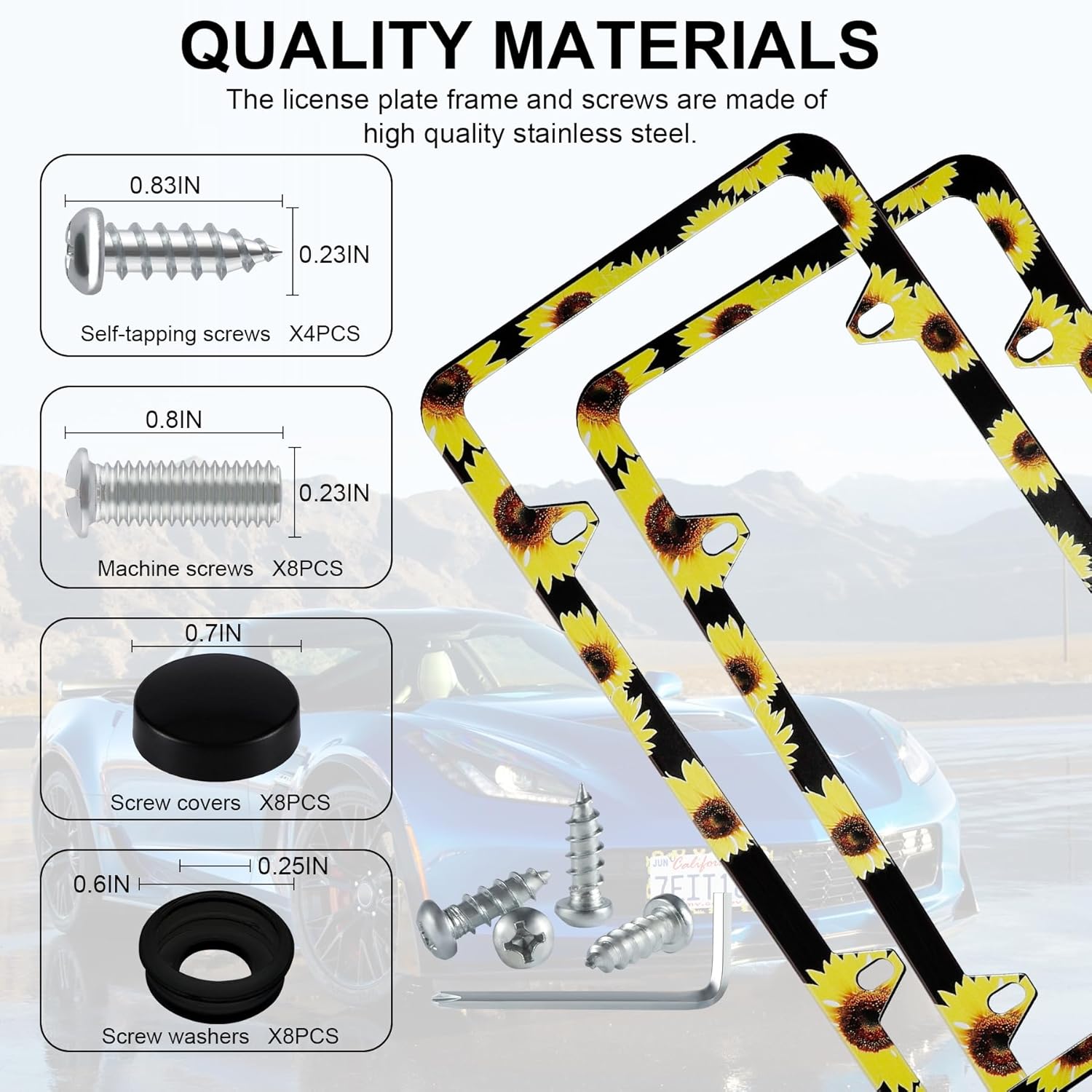 - 【Complete Installation Kit】 Includes 2 license plate frames and all the necessary accessories: 8 plastic screw caps, 8 plastic washers, 8 machine screws, 4 self-tapping screws, and 1 screwdriver. This all-in-one kit ensures easy and secure installation.