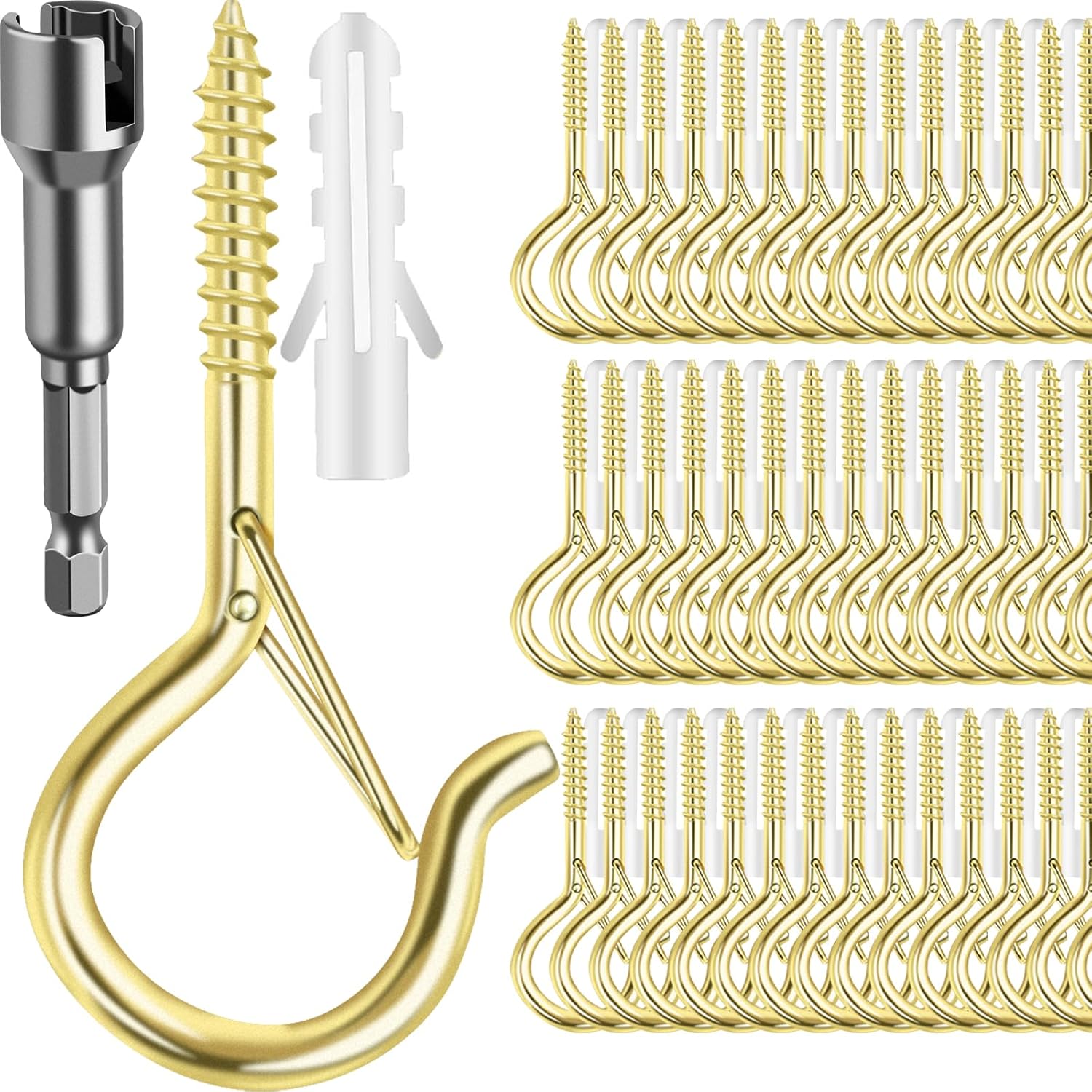 96 PCS Q-Hanger Hooks, Screw Hooks for Outdoor String Lights, Safety Buckle Design Cup Eye Hook for Hanging Christmas Lights, Plants, Mounted on Wall Ceiling, Include 1 Wing Nut Driver, Gold