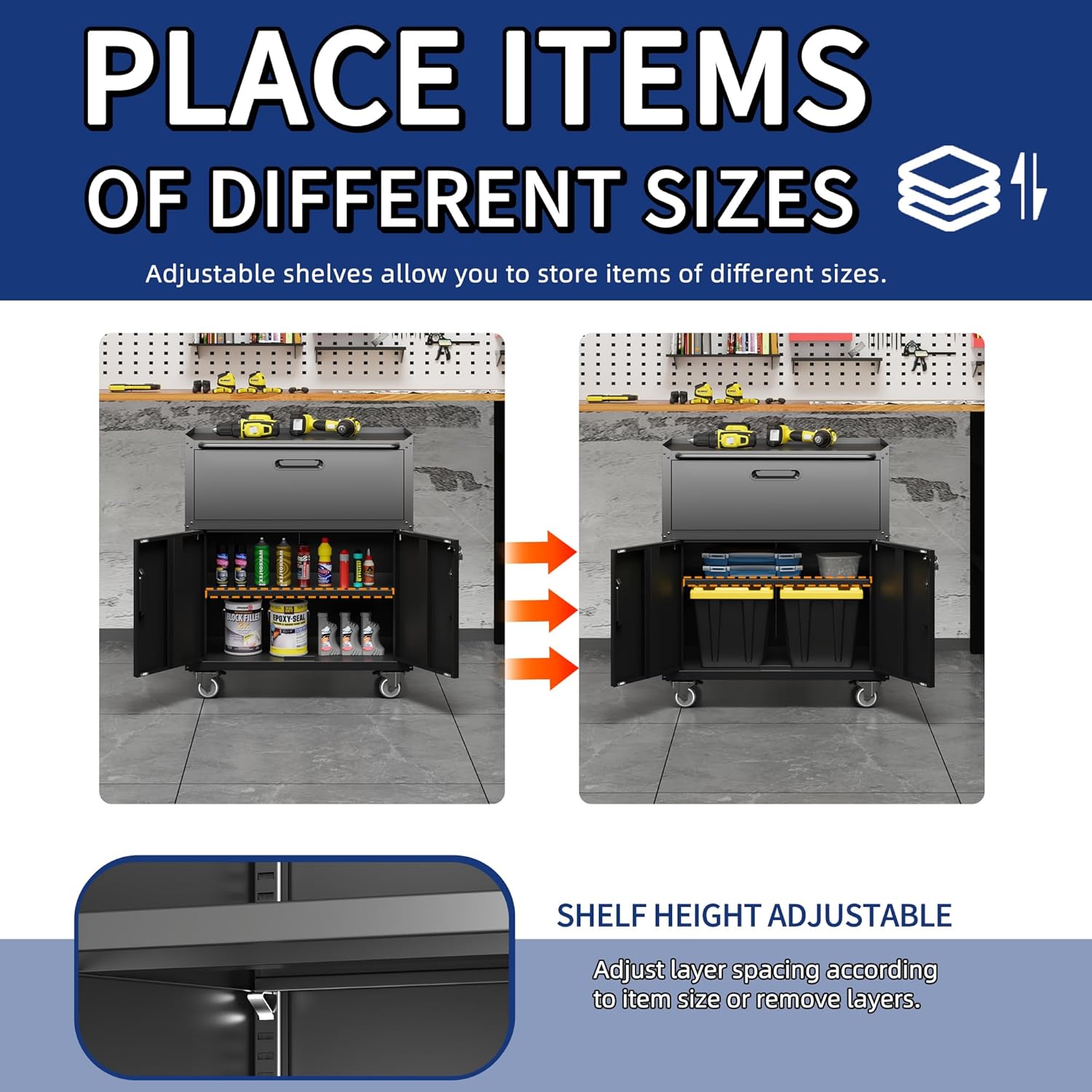 - Adjustable Shelf: The shelf in this rolling tool cabinet is adjustable and removable. You can adjust the height or remove the shelf to meet your different storage needs.You can adjust its shelf in any space you want to use.
