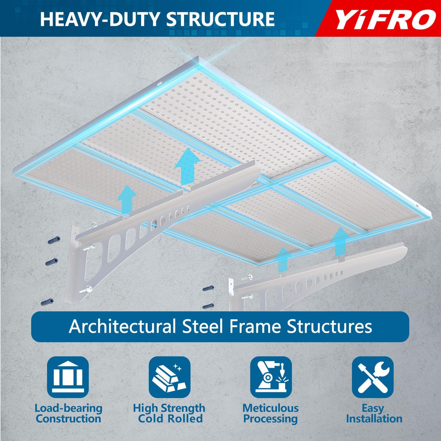 - HEAVY DUTY CONSTRUCTION: YIFRO garage wall shelving takes its cues from architectural frame construction, with a 2x3 ft individual bracket load capacity of 250 lbs. and a total of 1000 lbs. for 4 shelves, which makes it easy to store most of the items in your garage.