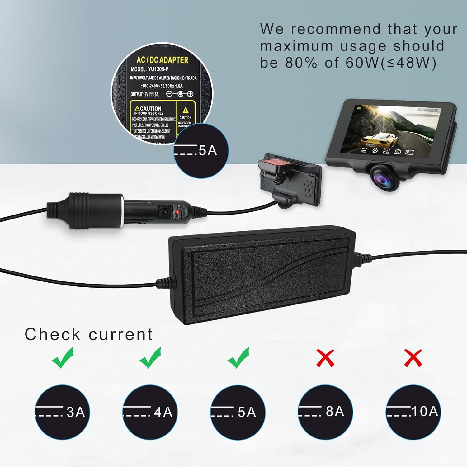 - Note: 12V 60W cigarette lighter adapter does not support devices over 60W. If device exceeding 12V 60W is connected, it will not work properly. Please check your device's power before ordering