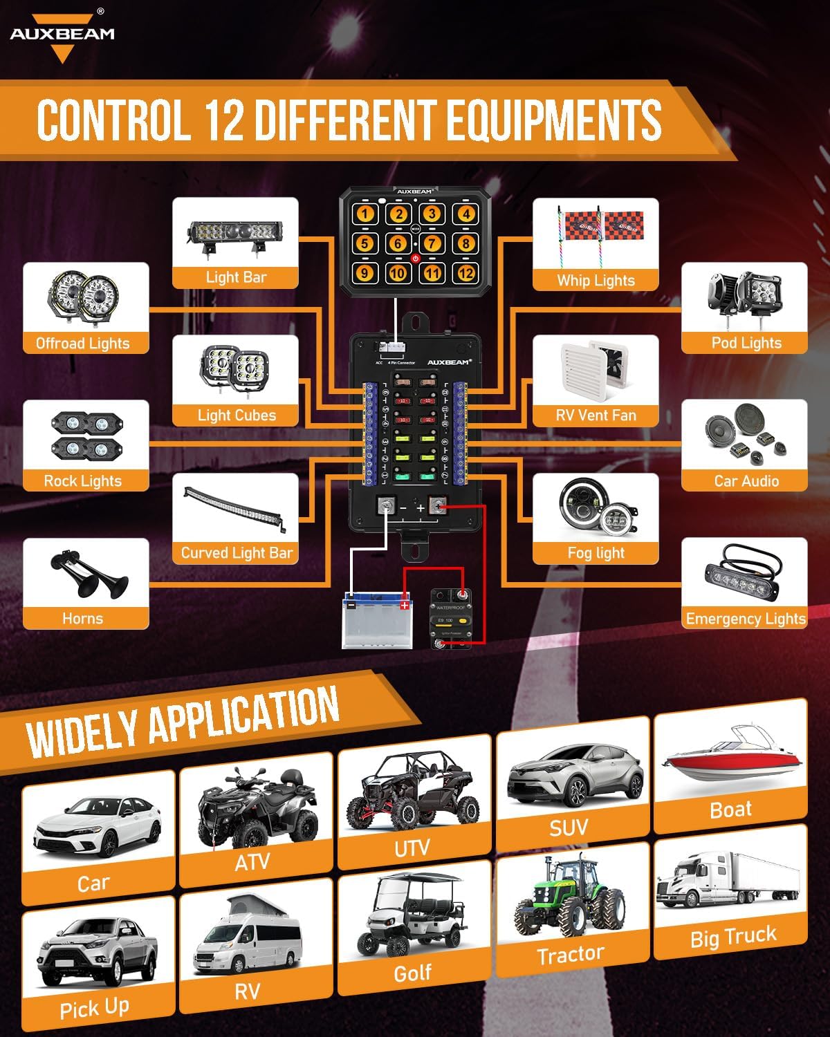 - Widely Use: It is great to control multiple devices with one switch panel! You can add multiple devices to your car, such as lights, exhaust fans, speakers, stereos, etc. It is widely used in RVs, trucks, sports cars, boats, UTVs, ATVs, and more. If you encounter any issues, please feel free to contact us.