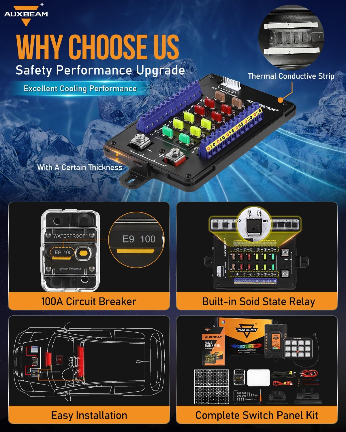 - Safe Protection: The car switch panel is highly sensitive and stable due to its solid-state relay. It is equipped with a circuit breaker that provides over-voltage protection, reverse polarity protection, over-current protection, and thermal protection. The base of the circuit control box is made thicker and includes thermal conductive strips inside, providing excellent heat dissipation.