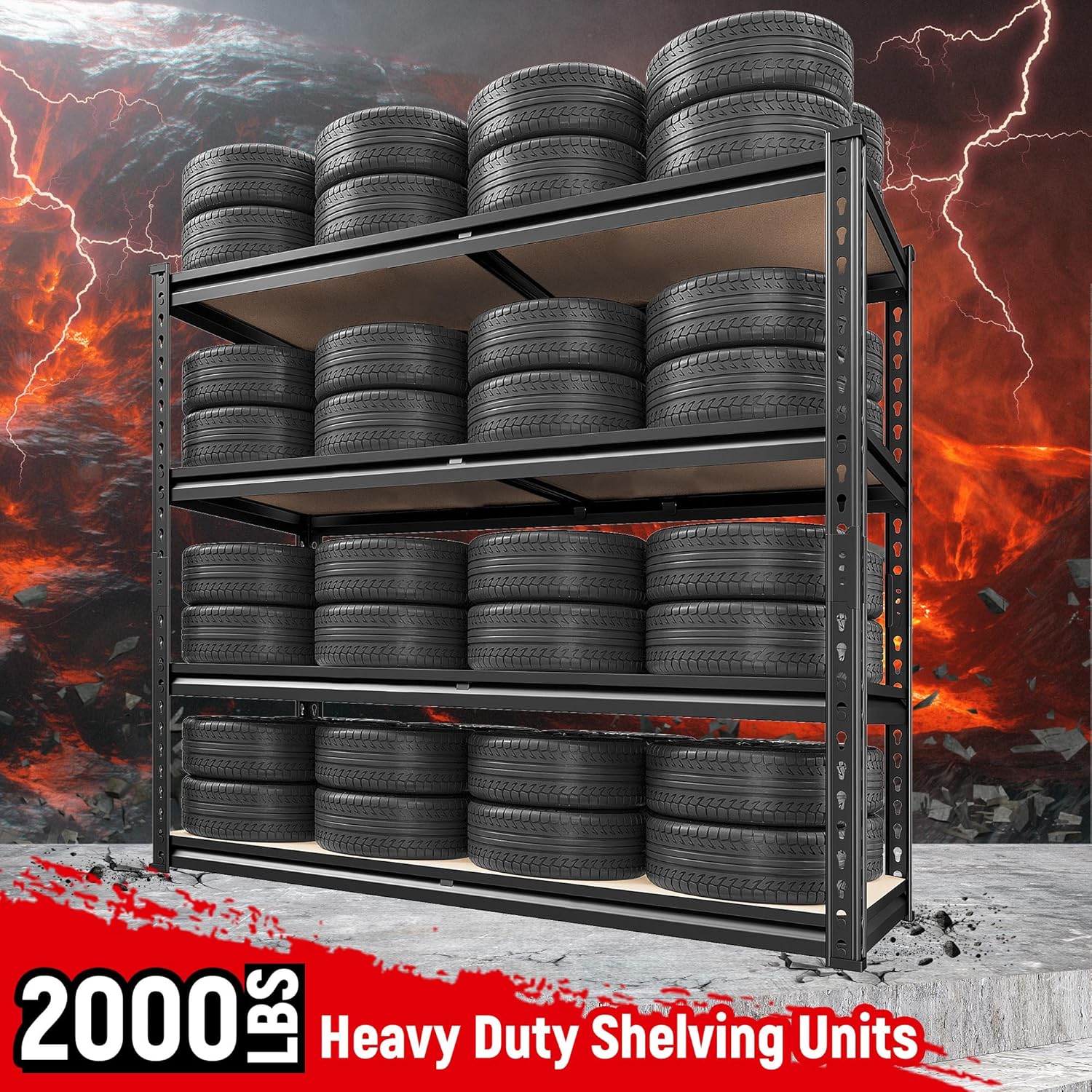 - 【2000LBS Capacity Storage Shelves】The heavy duty shelving has thickened metal frame, rolled edge and 5mm wood board, each metal shelves with big ribs beneath can hold up to 500 lbs, with a total bearing capacity of 2000 lbs, which makes garage shelves more sturdy and more stuff can be stored