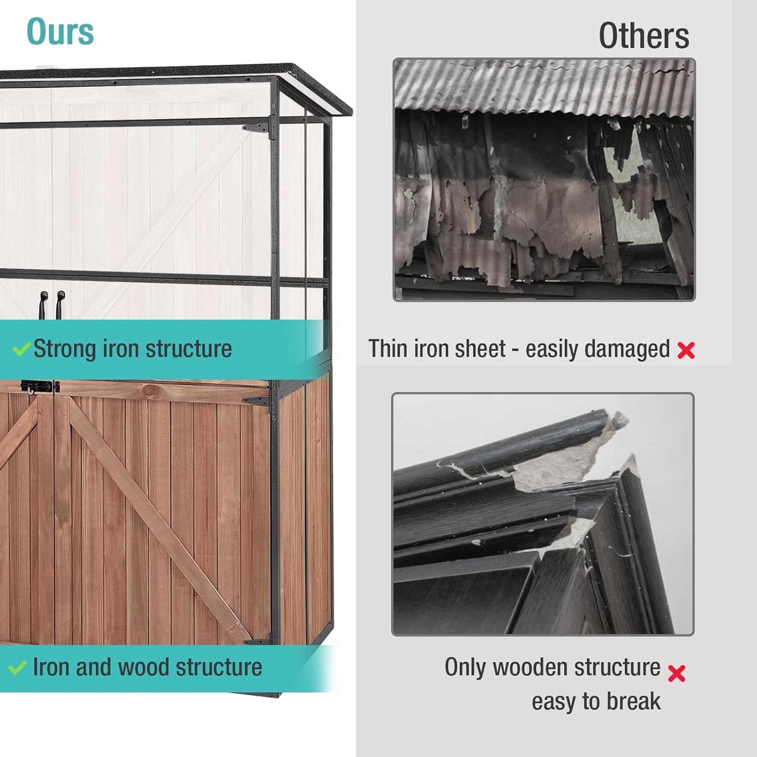 - Superior Structure: This storage shed is a perfect blend of sturdy metal frames and durable cedar wood, ensuring robustness and longevity. It's the perfect addition to your outdoor living space