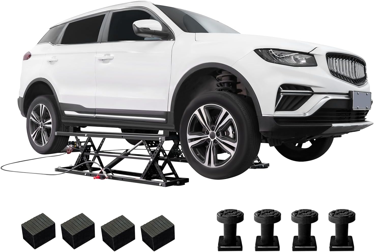 - Max Height of 28" with Flexible Adjustments: The auto lift is equipped with 4 height increments (75*75*100 mm), 4 adjustable height increments (170-260 mm) and 2 extension panels for a maximum lifting height of 26 inches, providing ample space to easy access underneath the vehicle for maintenance and inspections