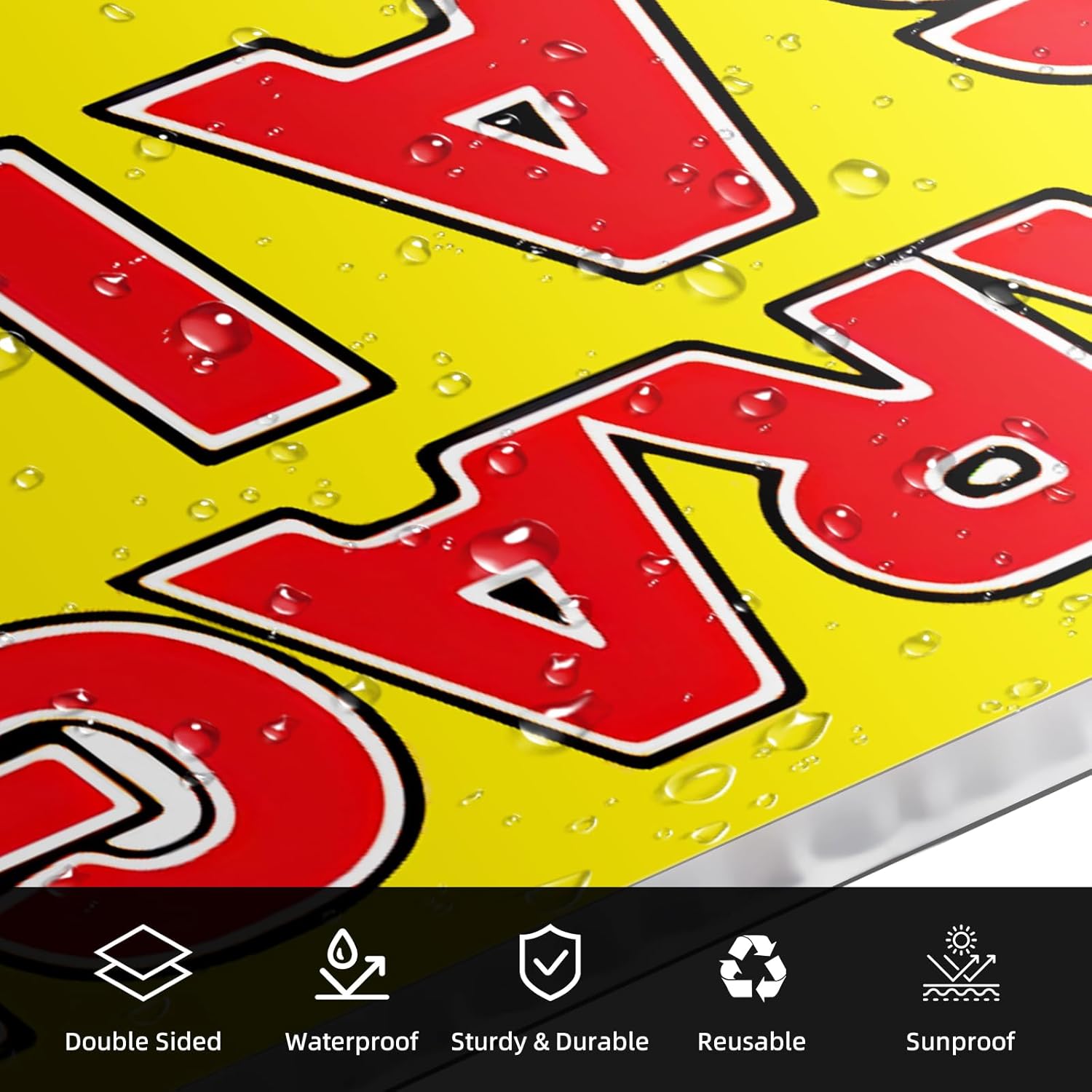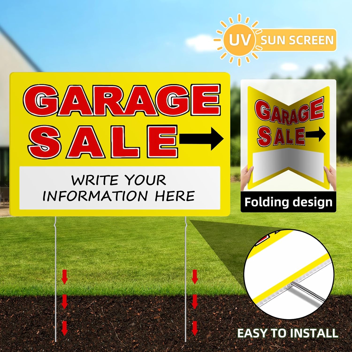- Durable Material: Garage sale signs with stakes are made of high quality corrugated plastic, very strong and able to withstand outdoor weather. The stakes are made of high quality metal material, not easy to deform or break. It can be reused for a long time.