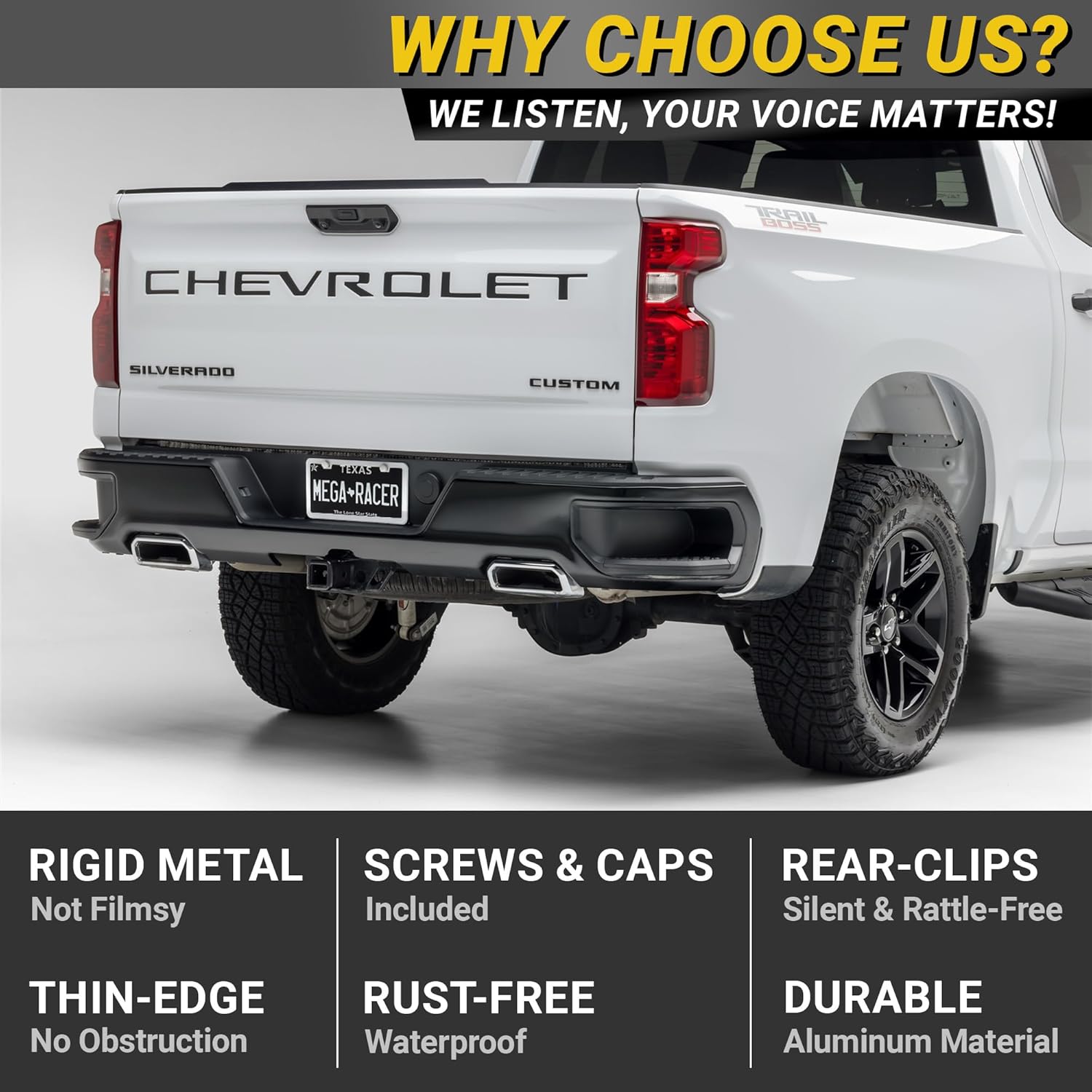 - CUSTOMER SERVICE: Mega Racer's 2 pc White License Plate Frame automotive accessories will leave both you and your ride satisfied. If you have any questions please send us a message via Amazon Message and we will be sure to respond within 24 hours.
