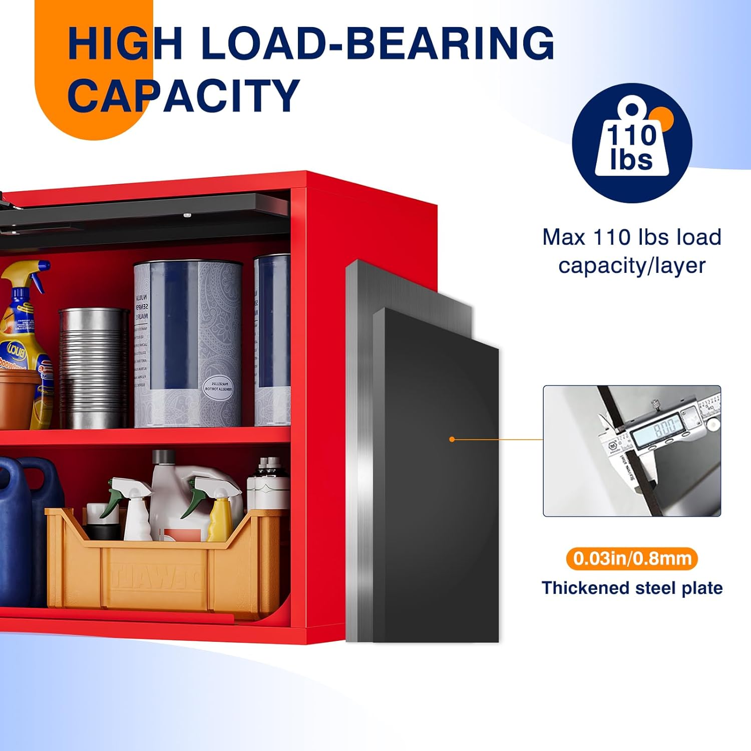 - 『PREMIUM QUALITY MATERIAL』 Heavy Duty Garage Storage Cabinets are made from 0.8mm high pressure steel plate that can withstand loads of up to 120lbs; the powder coating gives the cabinets a textured look and is rust and scratch resistant to complement a variety of decor styles.