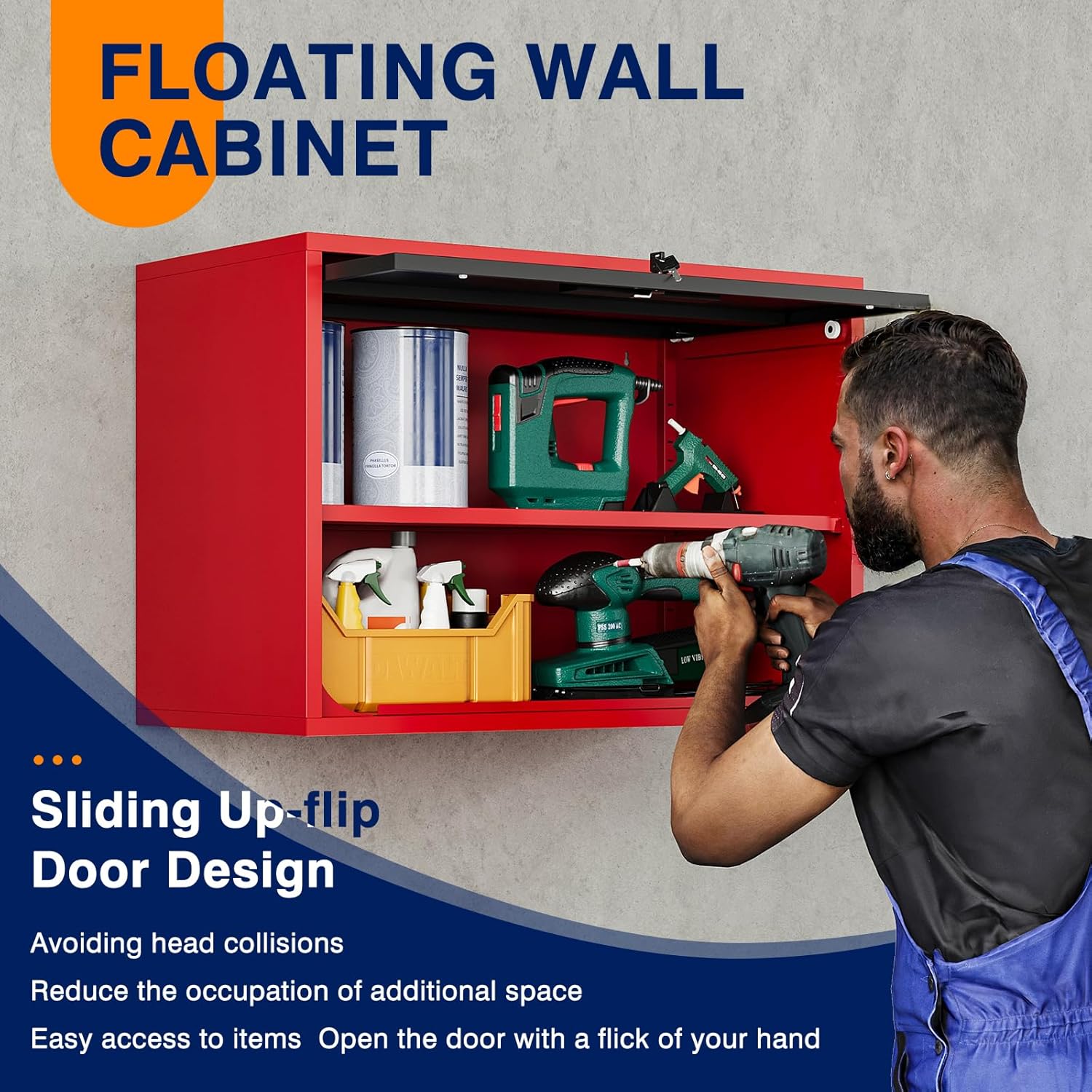- 『UTILIZE UPPER SPACE RATIONALLY』 31.5"W x 15.7"D x21.6"H-floating cabinet can effectively utilize the upper wall space, providing you with more storage space. Safety locked cupboards allow you to store hazardous paints to keep children and pets from touching them