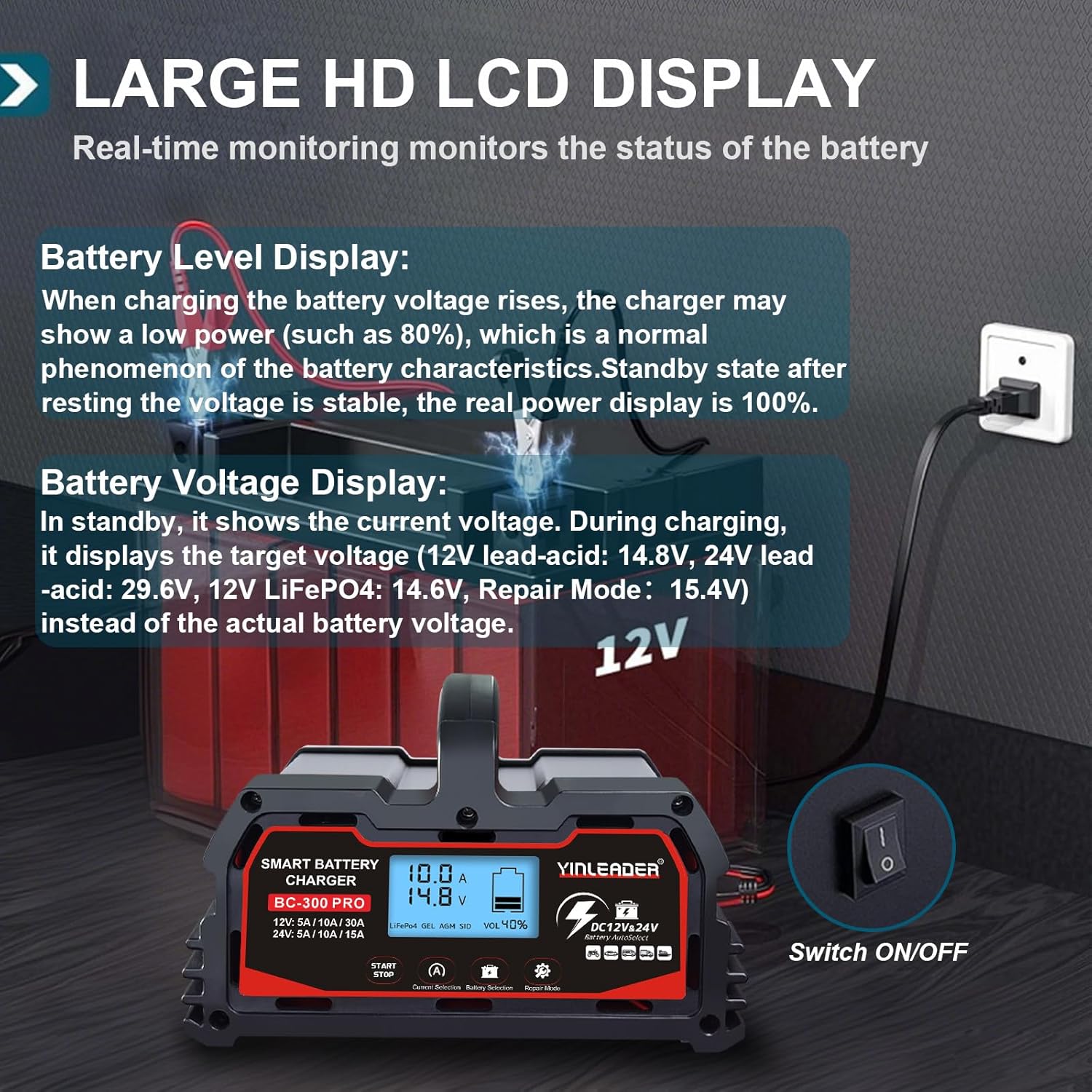 - Wide Range of Applications: It offers a variable charging current of (12V-5A/10A/30A)/(24V-5A/10A/15A) and 12V-LifePO4 battery charging, allowing you to choose the appropriate current for your battery size. Suitable for charging and repairing lead-acid batteries, including AGM, STD, GEL, SLA, etc, in cars, trucks, SUVs, motorcycles, lawnmowers, boats, and more.