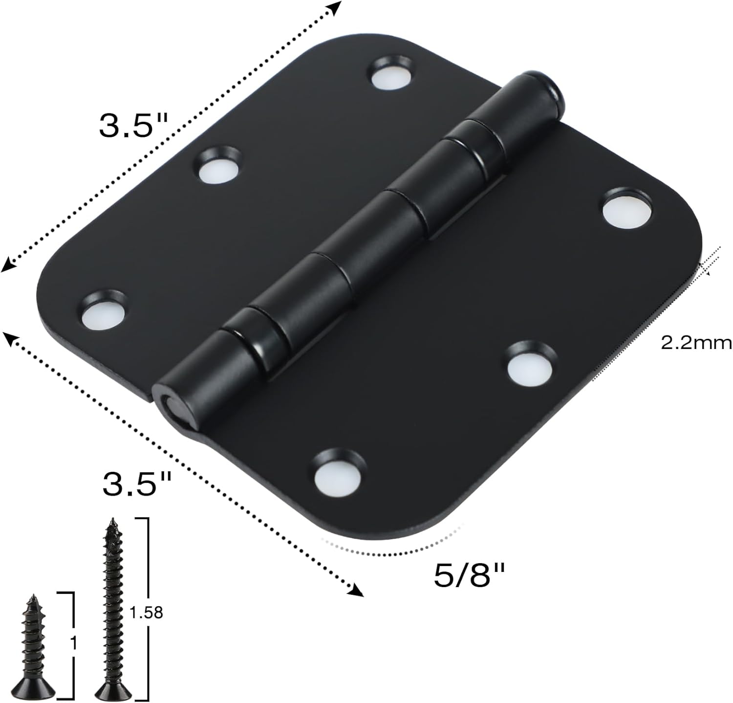 - Door hinges Black Matte 3.5 inch with 5/8 rounded corners and 6 holes for front door, cabinet, wooden box. Safe black door hinges 3.5" includes 6 free screws for quick and easy installation. Mat black door hinges can be rotated 270 degrees. The extra long screws will come in handy specially when replacing existing hardware using the same hole pattern.