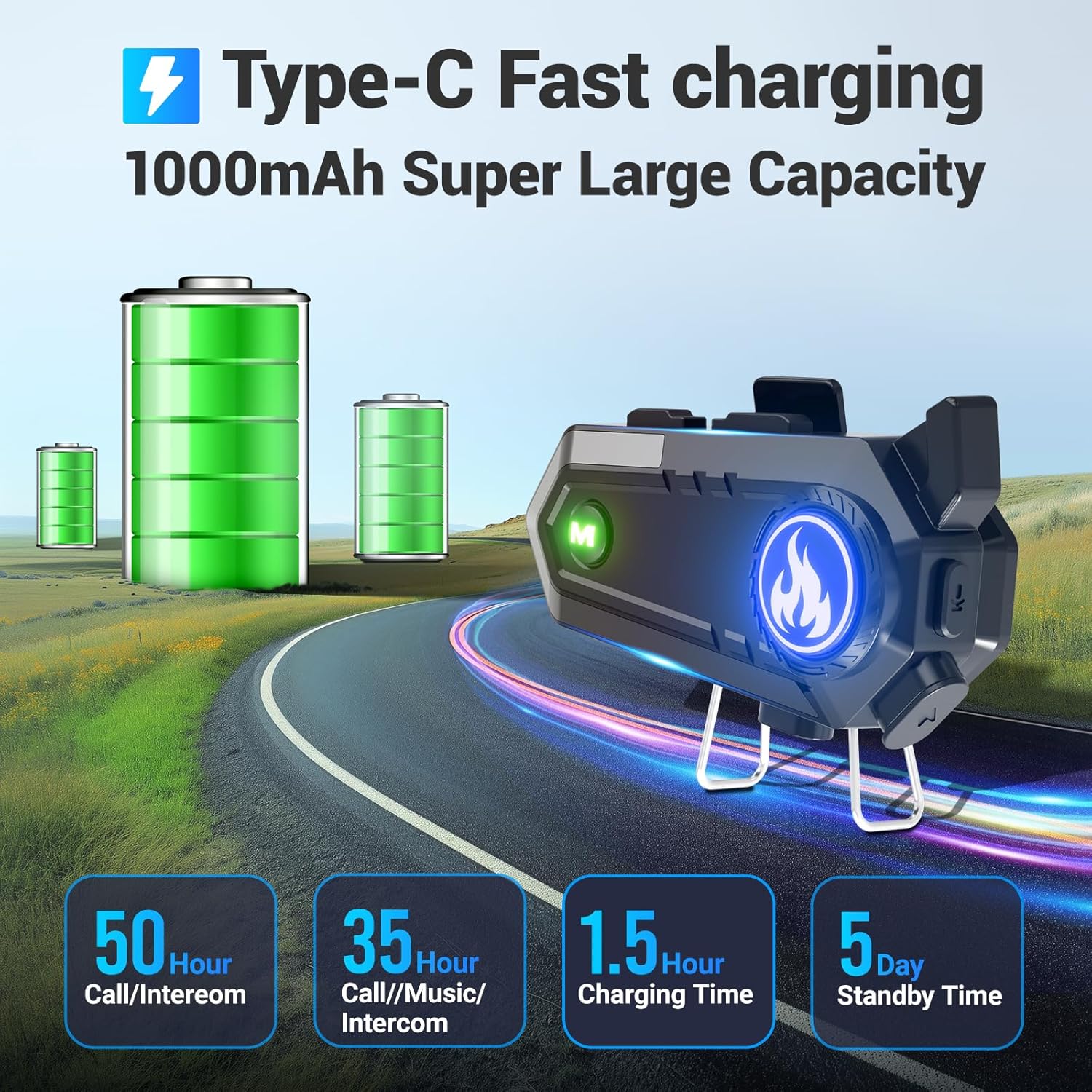 - 1000 mAh Longer Battery Life: Bluetooth motorcycle helmet With an 1000mAh lithium-ion battery and USB-C fast charging, 50 hours of music Share/call/intercom, 70 hours listen to the music, 120 hours of standby, and the helmet headset takes only 1.5 hours to fully charge, ensuring that you'll have continuous use throughout the day.