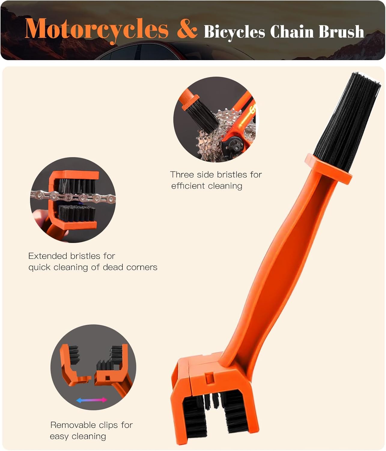 - EFFECTIVELY CLEANS HARD-TO-REACH DIRT: The versatile kit features hard bristles tire brush for wheel cleaning, 7.5-inch boar hair detailing brush for hard-to-reach areas, the detachable chain brush for easy cleaning of chains and gears. Clean your motorcycle inside and out effortlessly