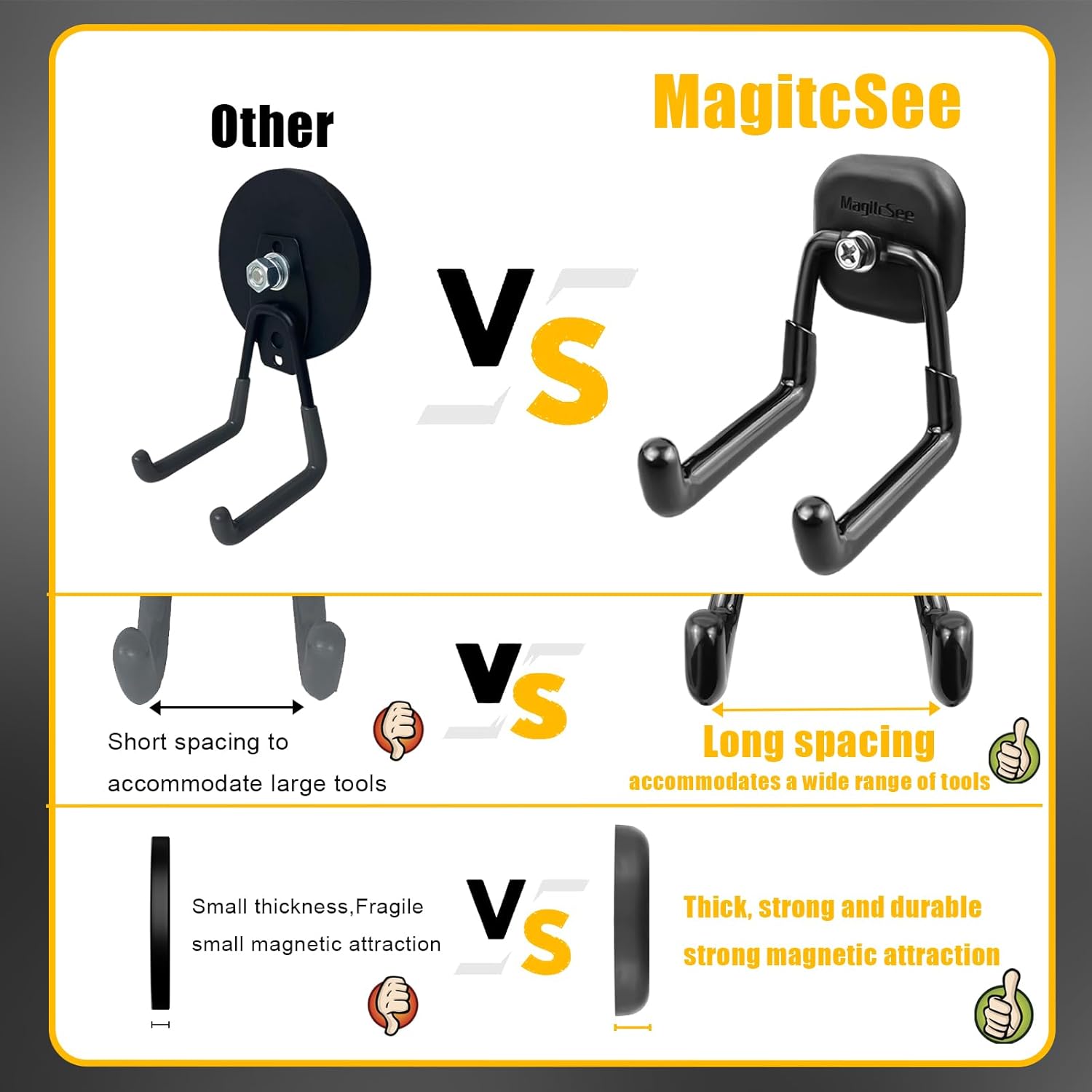 - Anti-Scratch: The rubber-coated magnetic base provides a soft and frictional surface while sticking firmly to metal surfaces.It won't scratch metal surfaces,and is water and rust resistant.The package includes two Magnetic hooks