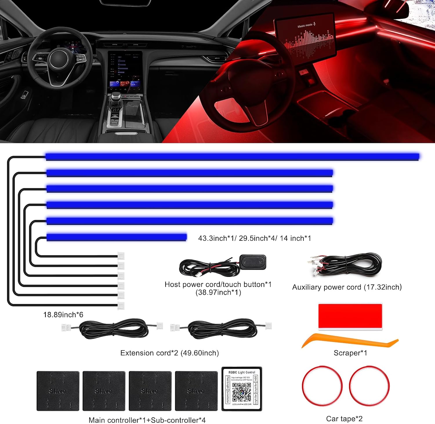 - Included Components : 6 in 1 Acrylic car light kit(4*29.5inch+1*43.3inch+1*14inch), Control box* 5, Pry tool*1+2*Adhesive tape, extension cord * 2 6 in 1 Acrylic car light kit(4*29.5inch+1*43.3inch+1*14inch), Control box* 5, Pry tool*1+2*Adhesive tape, extension cord * 2