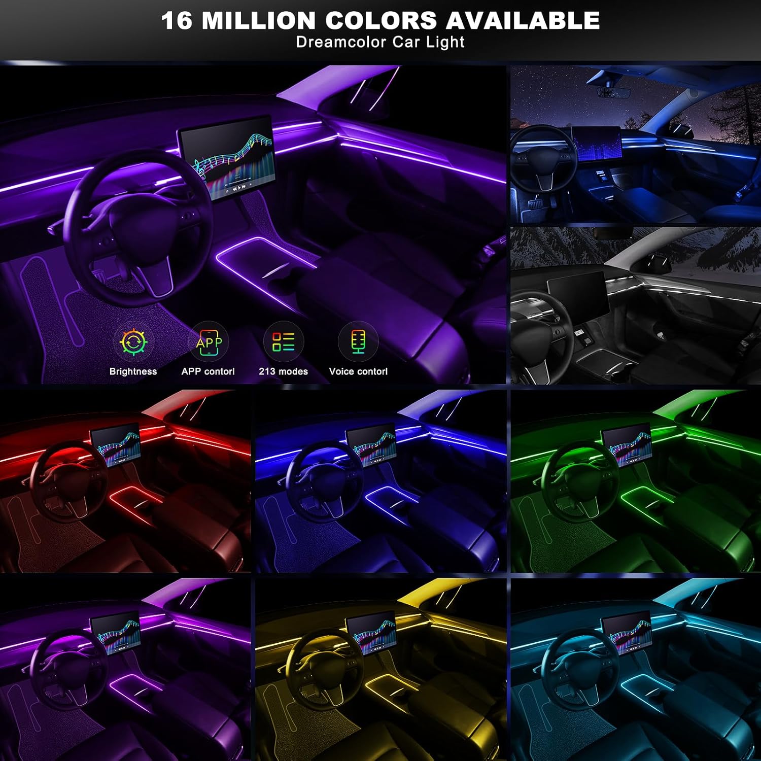 - 【Music Sensor】Built-in sound sensitive function, the Automobile Atmosphere Lamp can sync any sound captured from microphone, then change colors following the music rhythm as well as your voice.