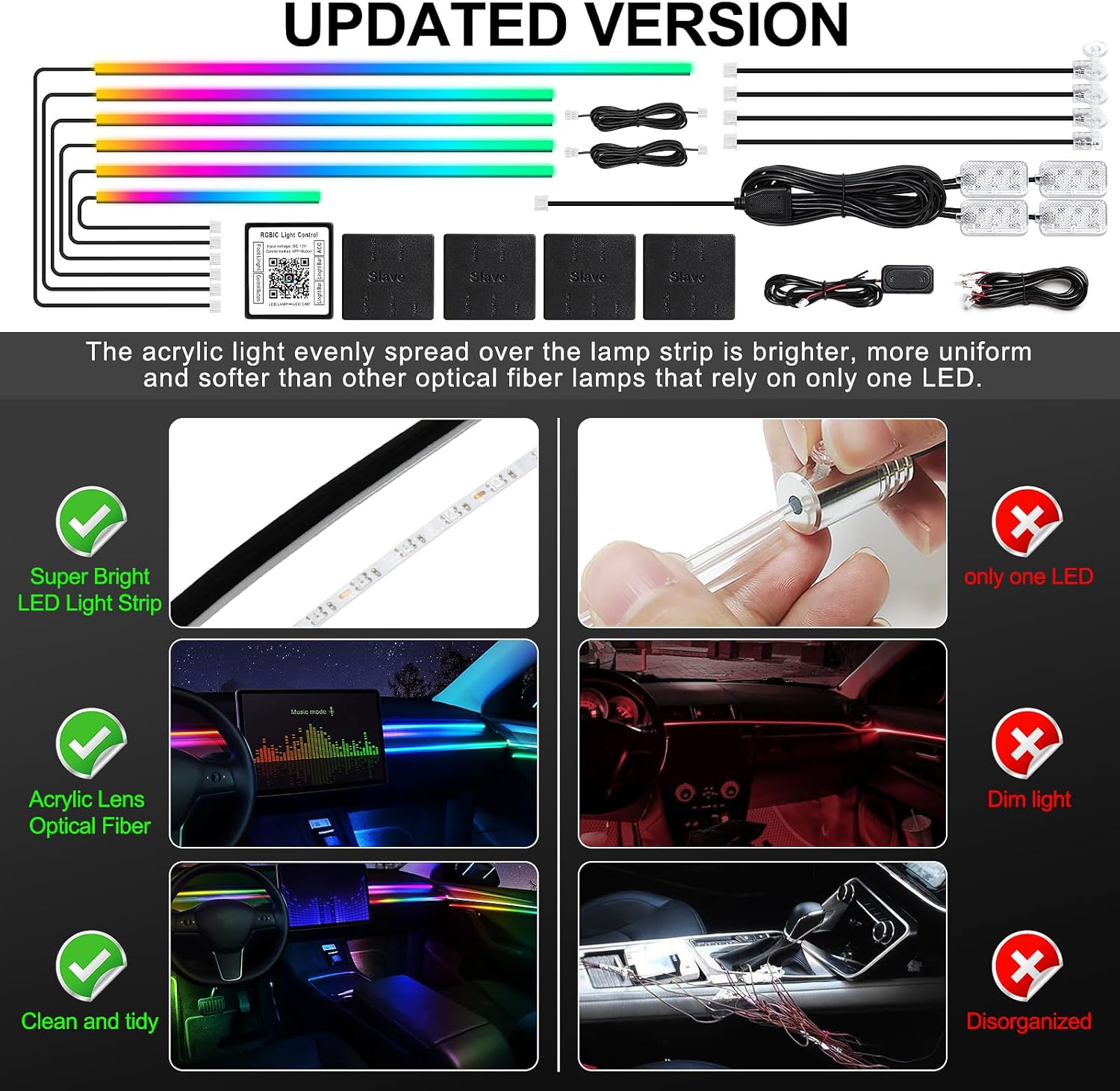 - 【High Bright & Uniform】The Dream+color Acrylic LED Car Ambient Interior Lighting have super bright LED and acrylic lens and contains 6 LED strips (4*29.5inch+1*43.3inch+1*14inch), Foot well lamp*4(44.5inch*2/64.9inch*2) and Door handle light*4(21.6inch), also comes with 1 main controller and 4 sub controllers,and can be flexibly installed on any car by DIY without disorganized, which is plug and play, and this acrylic light evenly spread over the lamp strip is brighter, more uniform and softer than other optical fiber lamps that rely on only one LED.