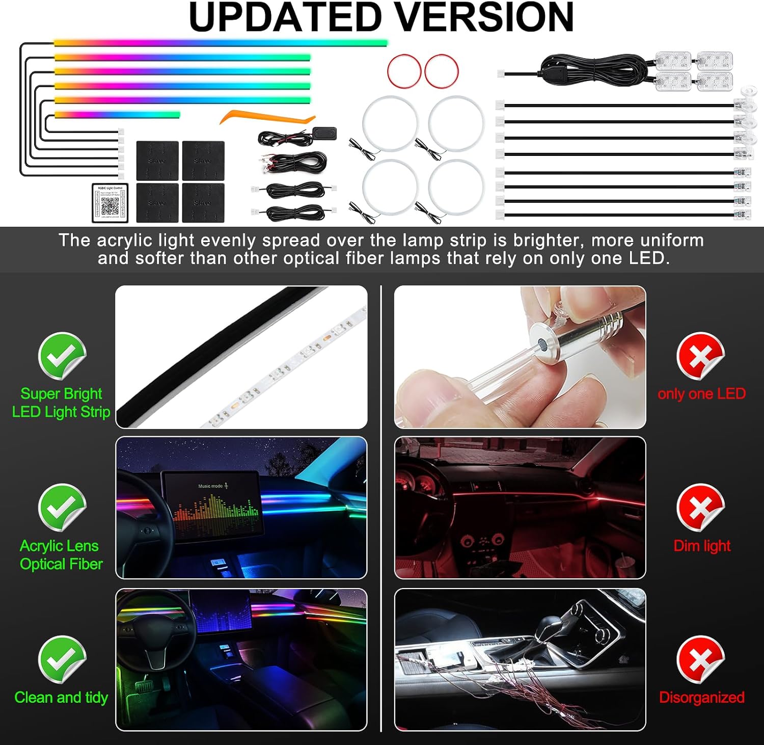- 【Cuttable】The acrylic ambient lighting car interior come with 6 LED strips (4*29.5inch+1*43.3inch+1*14inch) , Feel free to DIY length, Since the resistance of the last lamp of the acrylic lamp belt is three, when you cut, you need to reserve more length to avoid cutting to a resistor, and the end of the lamp strip will have a bar of color is not bright or the color is not synchronized, and then you can cut the end of the lamp strip that cannot be synchronized.