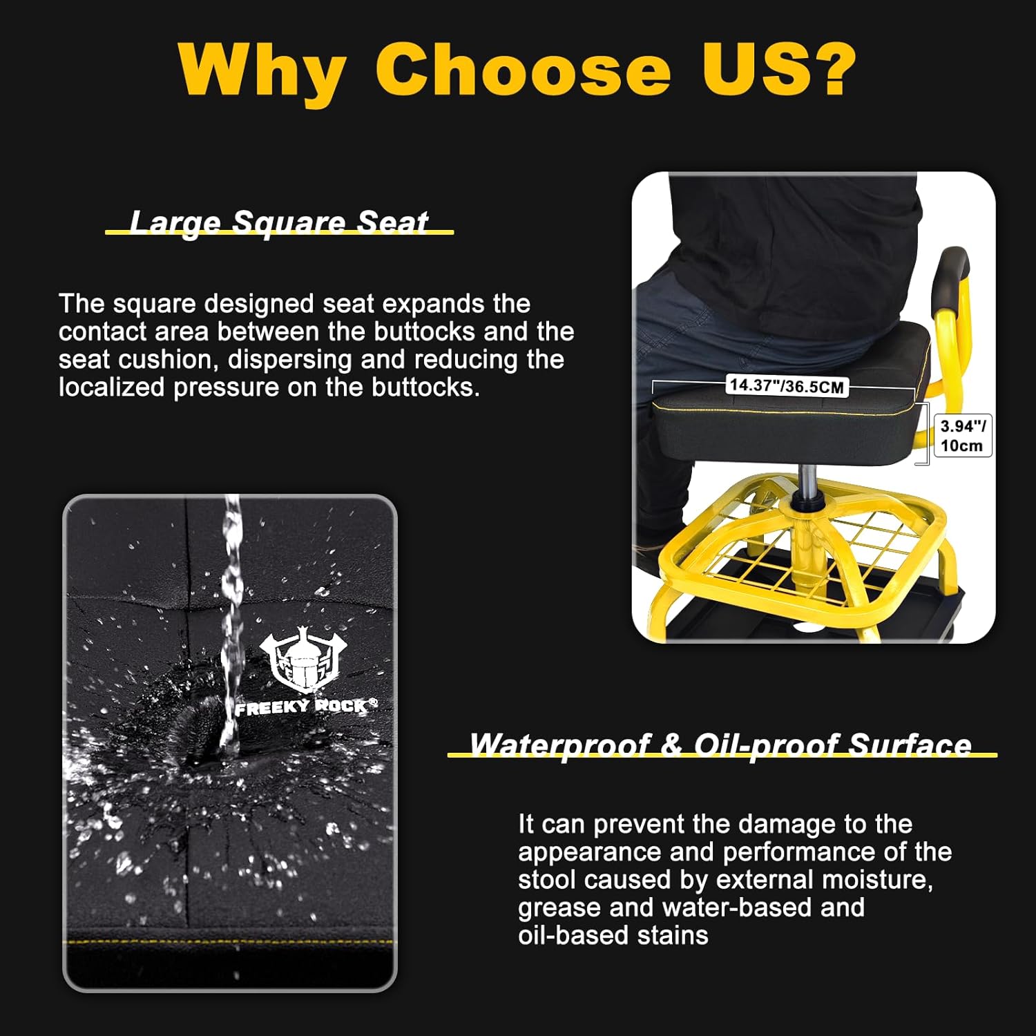 - 【Thickened Seat Cushion】14.37"/36.5CM Diameter Seat. 3.94"/10 CM height cushion. The thickened memory foam padded cushion seat is larger than other garage work stools. The cushion surface of stool is made of PVC material which is waterproof and oilproof, making it easy to be cleaned