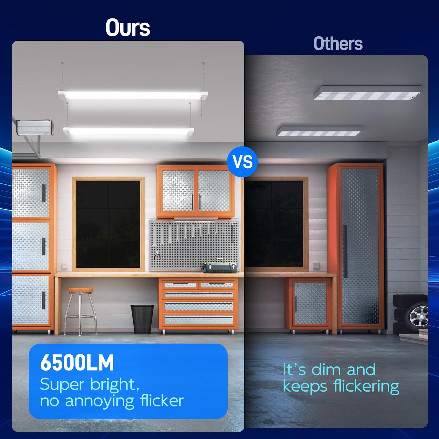 - ✅ Super Bright - 4FT led shop lights feature 6500 lumens brightness at 5000K Daylight White by using only 60W. That is a staggering LED Efficiency of 108 lm/w! Excellent replacement of conventional fluorescent fixture. Energy Savings of up to 75%.