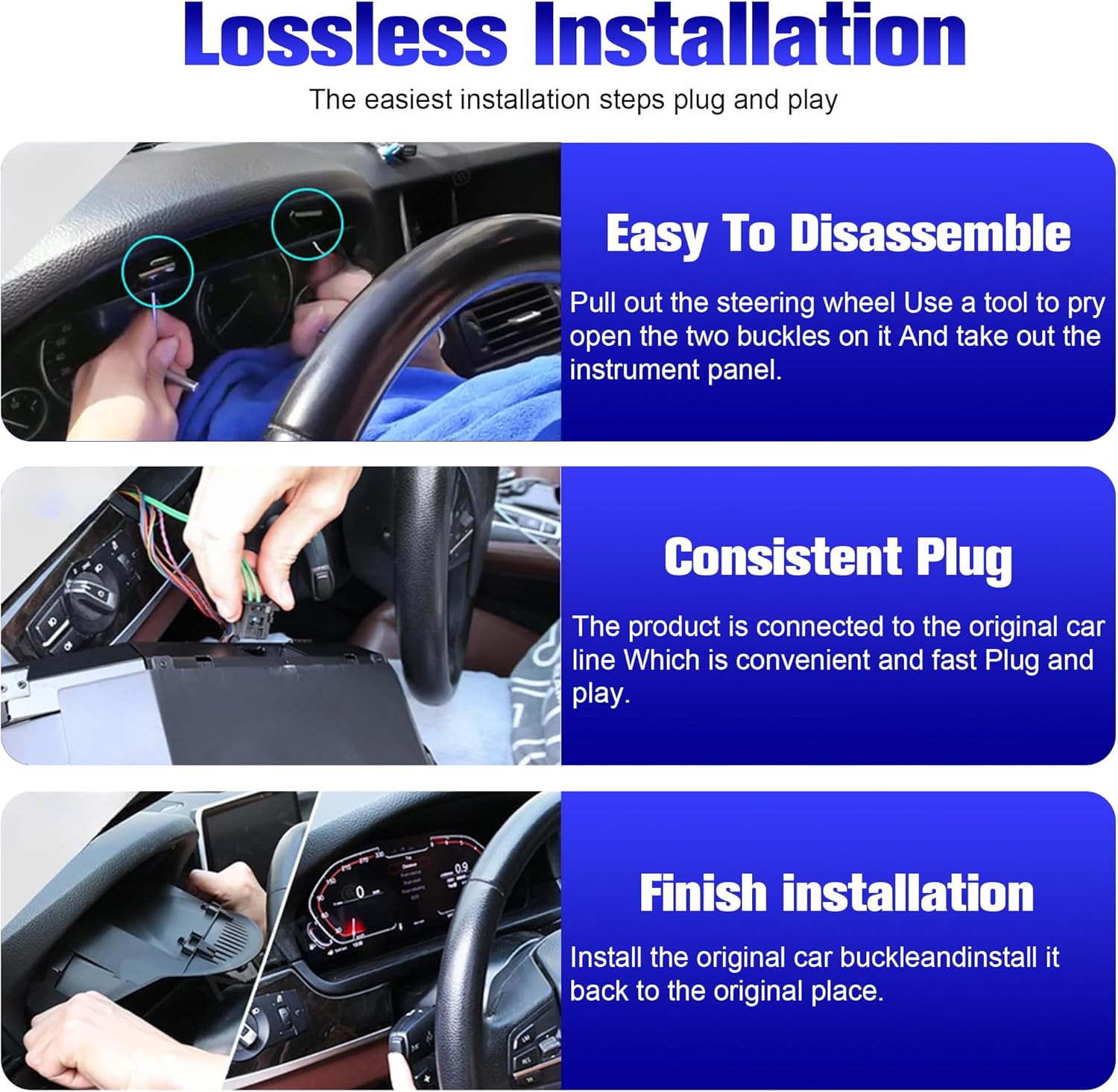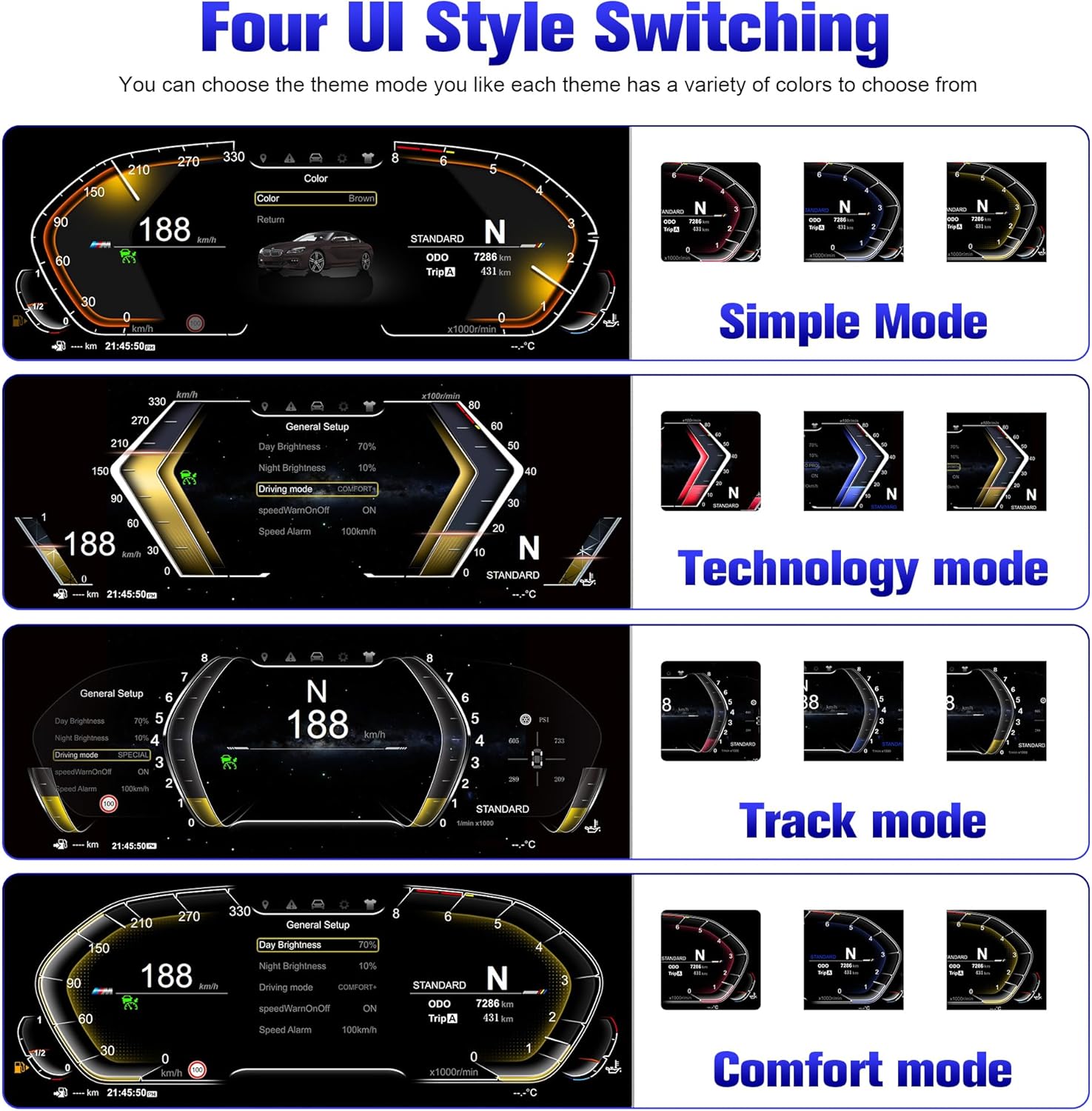 - āļø[4 sets of UI styles can be freely switched] This digital cluster features 4 customized modes (simple, comfortable, track, and technology) for the LCD. Additionally, it offers 4 color interfaces (red, purple, blue, and orange) that can be freely changed to enhance your driving comfort. The original vehicle data and information are presented more intuitively