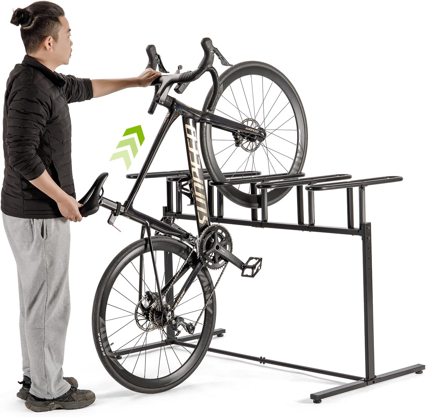 - 【Easy to Use】: The bike stand can be positioned to face one direction for wall displays or staggered for added stability and accessibility. Our bike rack stand makes it easy to grab your bike and go for a ride whenever you want, without having to untangle it from a pile of clutter. NOTE: We recommend that you stagger yours bicycles to prevent the handlebars tangle.