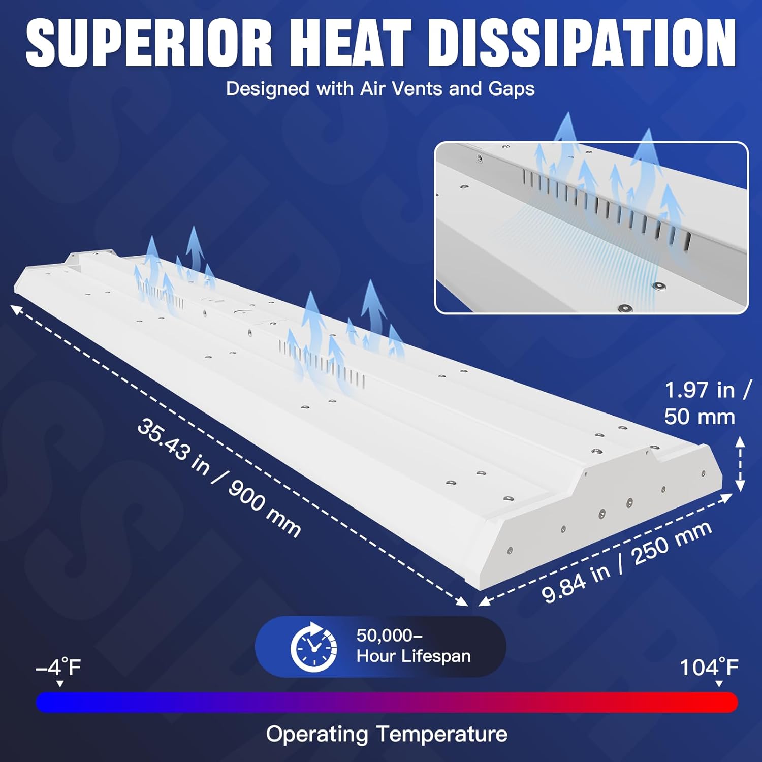 - 【Superb Heat Radiation】The linear highbay workshop light has a great heat dissipation design. Its anti-rust aviation aluminum housing has multiple heat dissipation holes. This design gives it remarkable heat dissipation capabilities, ensuring a 50,000-hour lifespan (8 hours daily use equals 17 years).