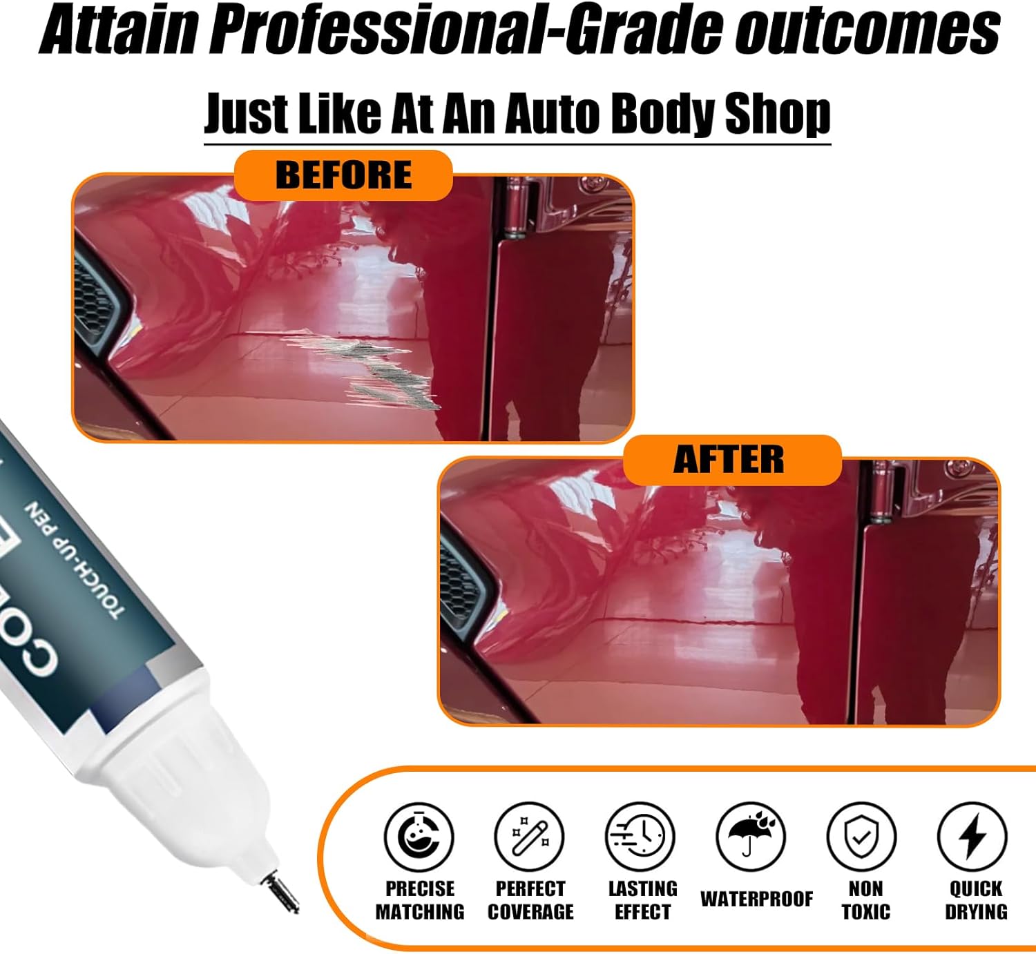 - 【Repair scratches quickly and simply】This car scratch repair paint has strong adhesion, anti-rust, and waterproof properties that protect your car's surface from further damage. With a 2-in-1 uses design, each bottle of car paint comes with a pen pin and brush, ensuring a hassle-free application