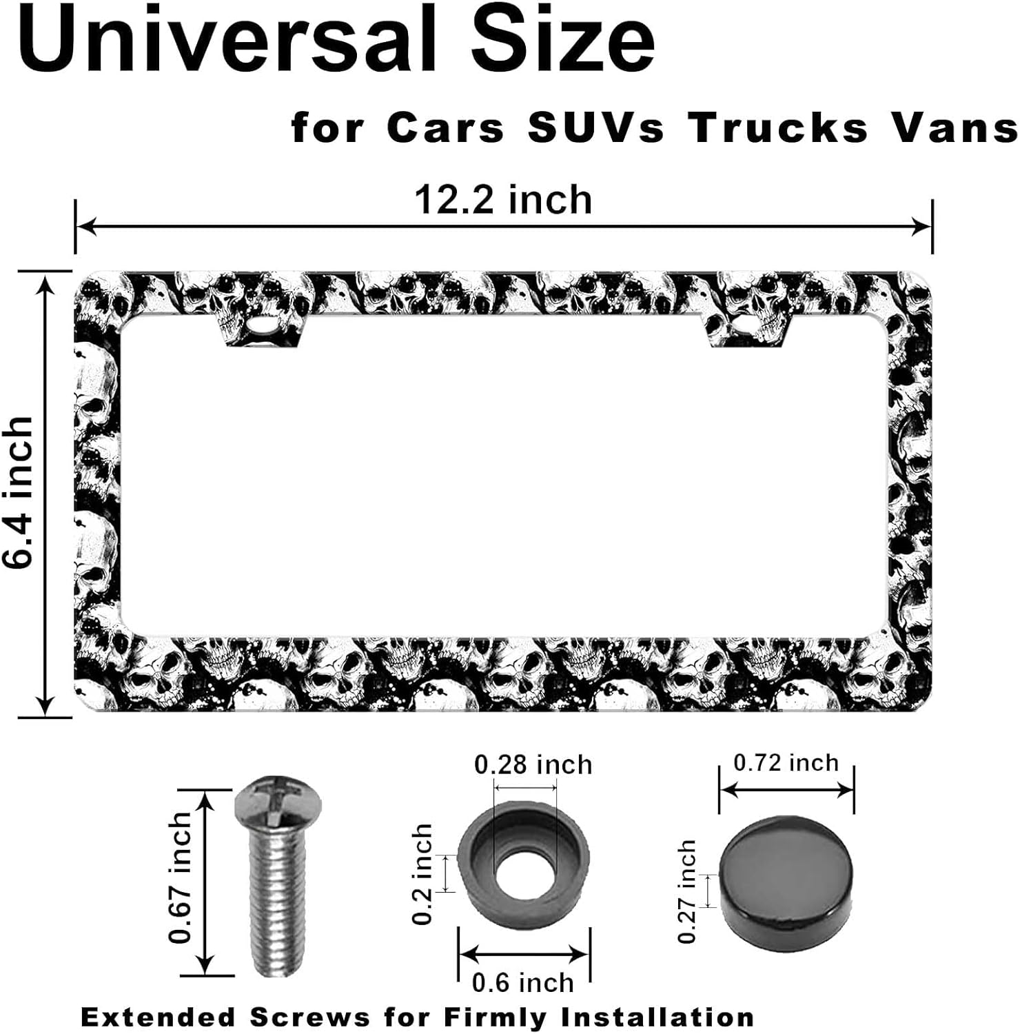 - Fits ALL US Vehicles: Universal Design Works with Any U.S. standard size 12-1/4" x 6-3/8"Plate . Fits most Cars Sedans, SUVs & Trucks. Secure & Rattle-Free – skull and bones License Plate cover frame with Anti-Vibration Pads