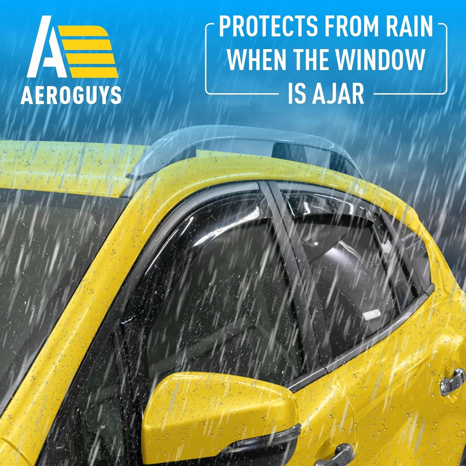 - No Tools Needed, Quick and Easy Assembly β These rain guards are very easy to fit. IN-CHANNEL INSTALLATION provides perfect fit for your car. Just slip it onto your carβs window and your job is done within minutes. There is no drilling or no tools required. Be sure that AEROGUYS window deflectors are water resistant, sun protective and will not bend, break or crack regardless of the weather conditions.