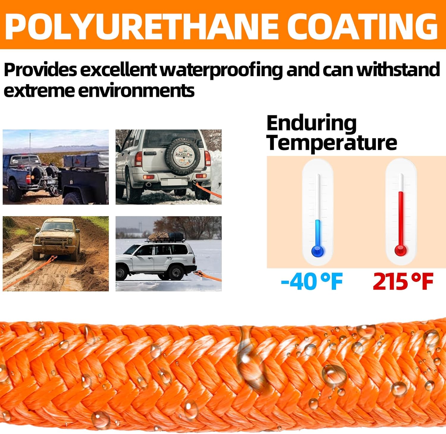 - Double Diamond Braid and Vinyl Polymer Coating: The double braid shell of our recovery strap is infused with a vinyl polymer coating, offering exceptional waterproof and UV-resistant properties. Withstanding temperatures ranging from -40°F to 215°F, it ensures durability in extreme conditions. Additionally, both ends of the recovery straps heavy duty feature polyurethane coatings for increased wear resistance, corrosion protection, and easy cleaning