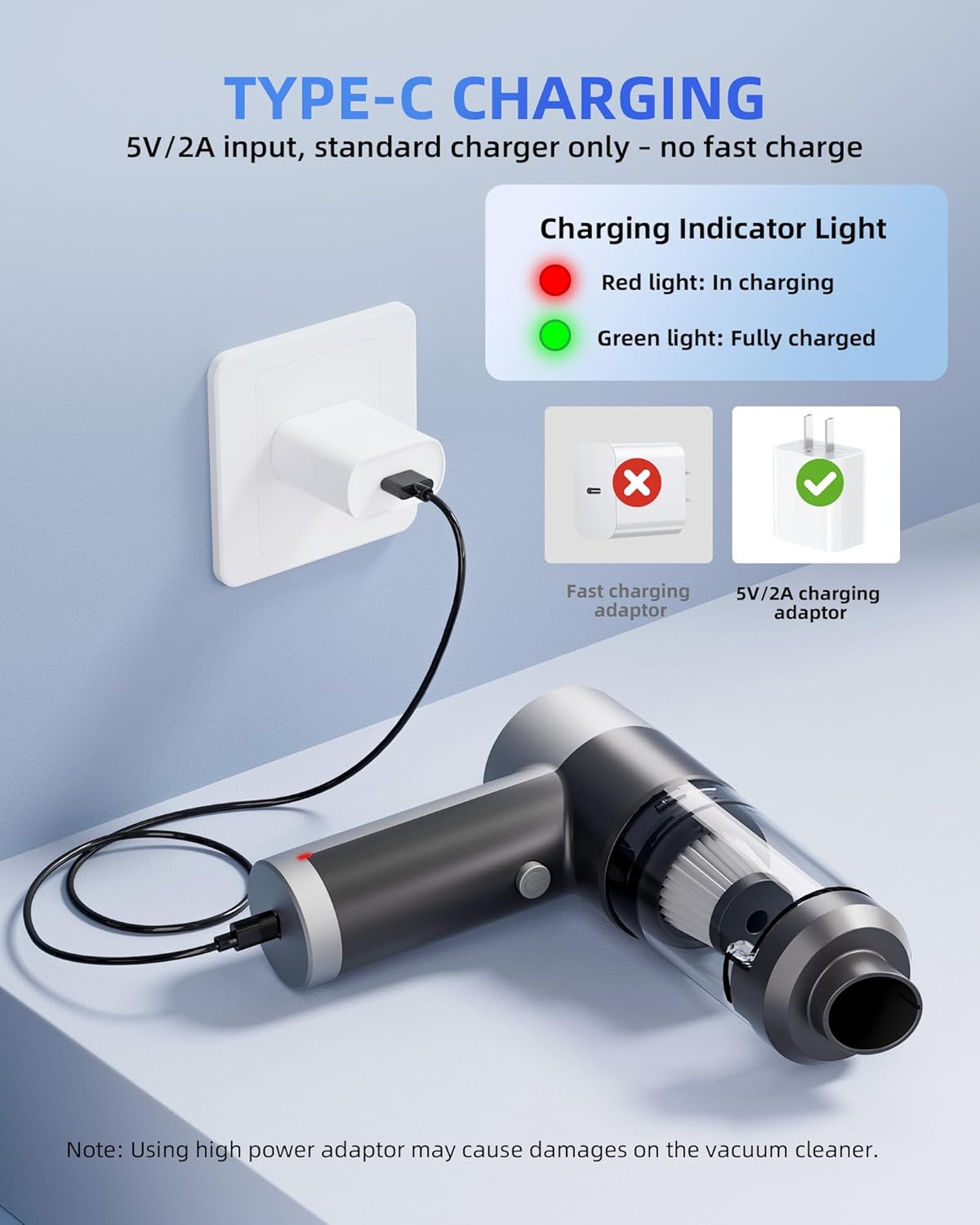 - 17,000PA SUCTION, QUICK CLEAN-UP: Powerful car vacuum with 17,000pa suction leaves no stubborn crumbs untouched. This car vacuum cleaner features 2 suction levels, eco mode at 10,000pa can be used for 30 mins, and fast mode can be used for 15 mins. Whether it’s crumbs from your kids or daily car messes—this mini vacuum is the perfect cleanning tool