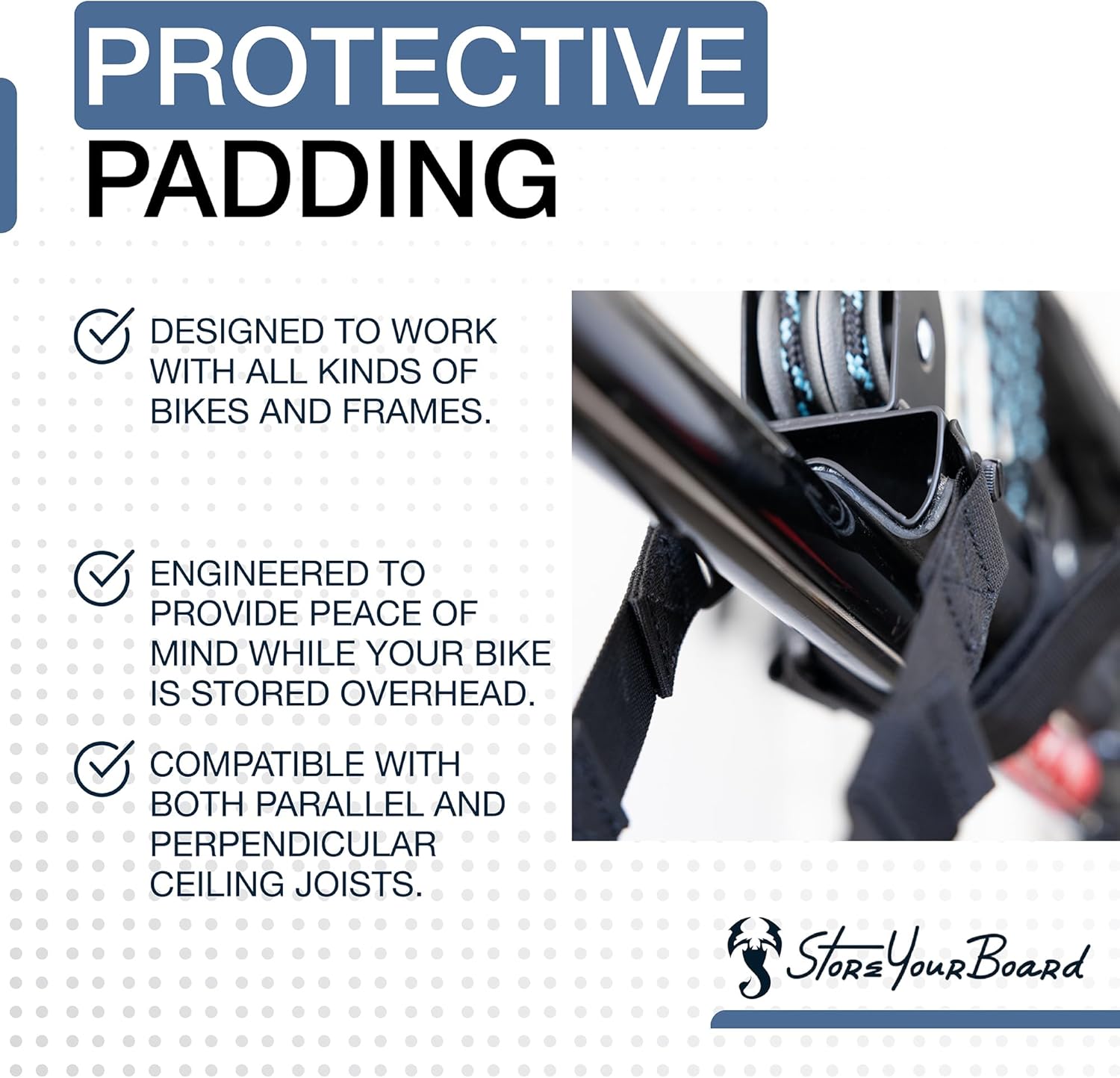 - No-Slip Storage: Overhead bike storage that won’t slip, tilt, or drop. Unlike others that leave the bike loose or wobbly, this hoist stabilizes the frame, front wheel, and handlebars with a hook-and-loop strap and an adjustable buckle strap.